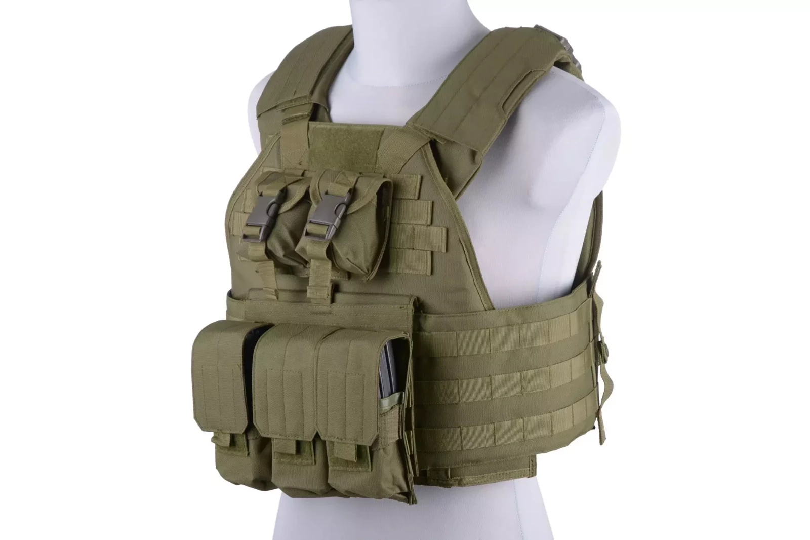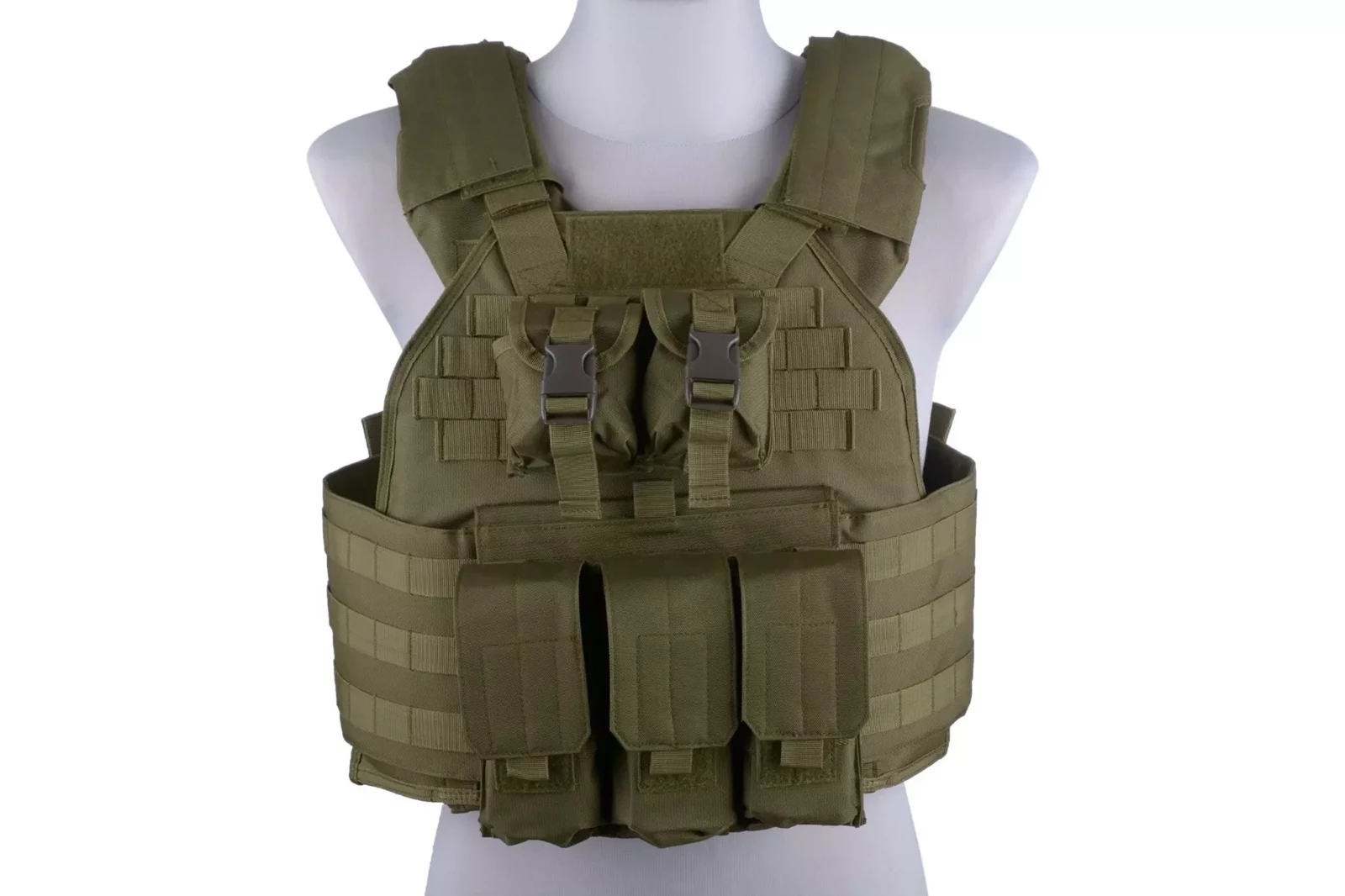 Wykonana z wytrzymałego nylonu kamizelka taktyczna typu Plate Carrier pozwala na przenoszenie 2 wkładów balistycznych (brak w zestawie)oraz różnego rodzaju wyposażenia. Dwa pełne panele pokryte taśmami w systemie MOLLE połączone są szerokim cummerbundem, zapinanym na klamry, pozwalającym na montaż dodatkowych ładownic, a także szerokimi szelkami z odpinanym comfort padem. Szelki posiadają także klamrę która umożliwia łatwe założenie lub zdjęcie kamizelki. Z tyłu umieszczono solidny uchwyt ewakuacyjny. Z przodu kamizelki umieszczono dwie ładownice na granaty lub inne, podobne gabarytowo przedmioty oraz potrójną ładownicę na magazynki. W górnej cześć kamizelki umieszczono także mały panel rzepowy.