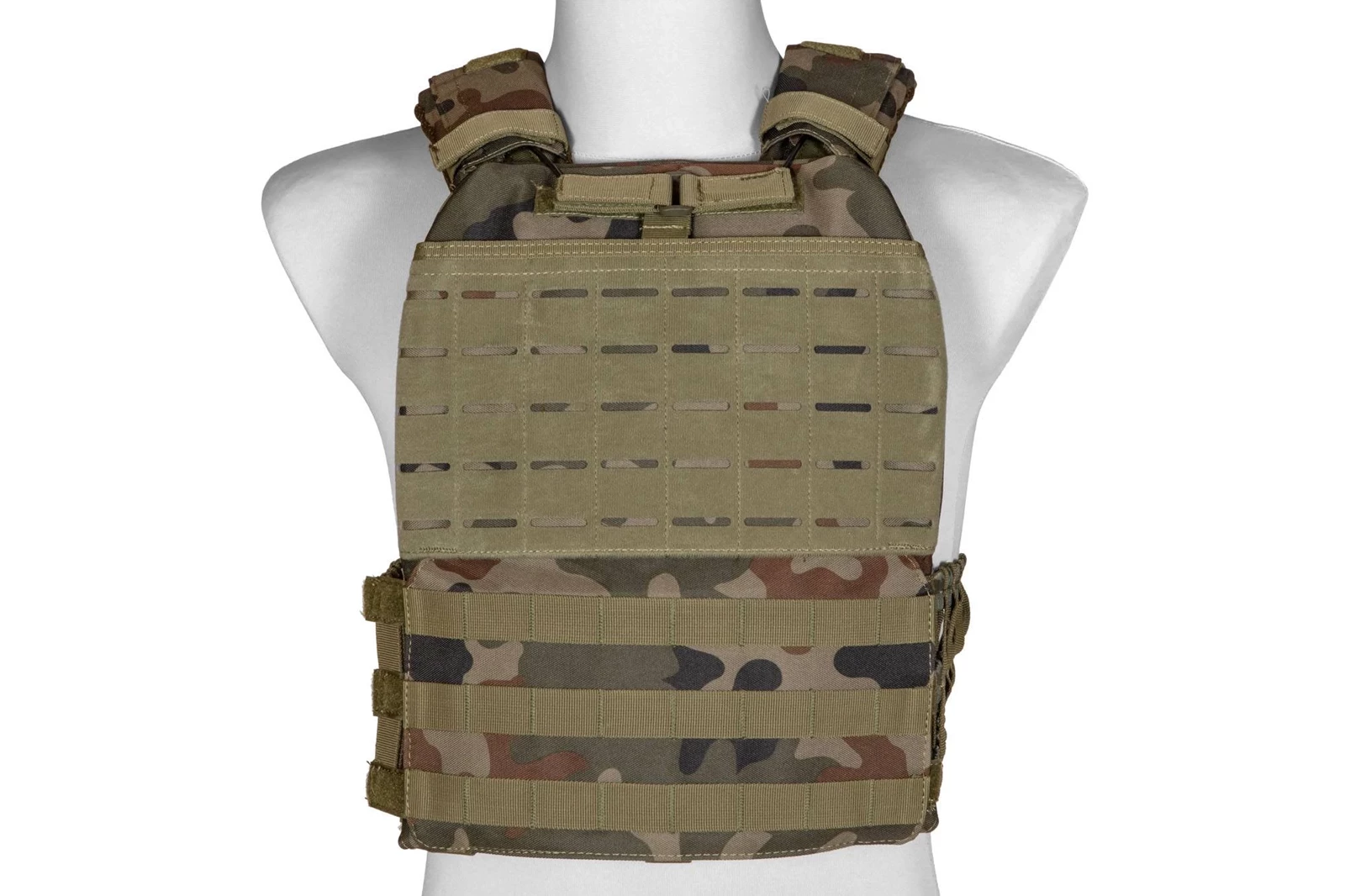 Wykonana z wytrzymałego nylonu kamizelka typu plate carrier łączy w sobie dwa rozwiązania: połączenie klasycznego systemu molle z naszytymi palsami oraz systemu Laser-Cut który pozwoli na zaoszczędzenie ciężaru kamizelki. Kamizelka wyposażona została w trzy rzędy klasycznych palsów molle, znajdujących się z przodu i z tyłu kamizelki oraz 5 rzędów otworów Laser-Cut. Górny panel posiada także płaską, zapinaną na rzep kieszeńnp. na dokumenty czy mapy. Przedni i tylny panel połączony jest rozciągliwym, bardzo lekkim cummerbundem który umożliwia także montaż dodatkowych ładownic. W górnej części kamizelki zastosowana miękkie, szerokie szelki poprawiające komfort użytkowania. Z tyłu kamizelki umieszczono uchwyt ewakuacyjny a także uchwyt systemu Quick Relase (system szybkie zdjęcia kamizelki - wystarczy jedno mocne pociągnięcie). W wewnętrznej części kamizelki znajdują się obszyte siatką "pady" poprawiające wentylację powietrza. W środku kamizelki znajdują się miejsca na wkłady balistyczne (brak w zestawie).