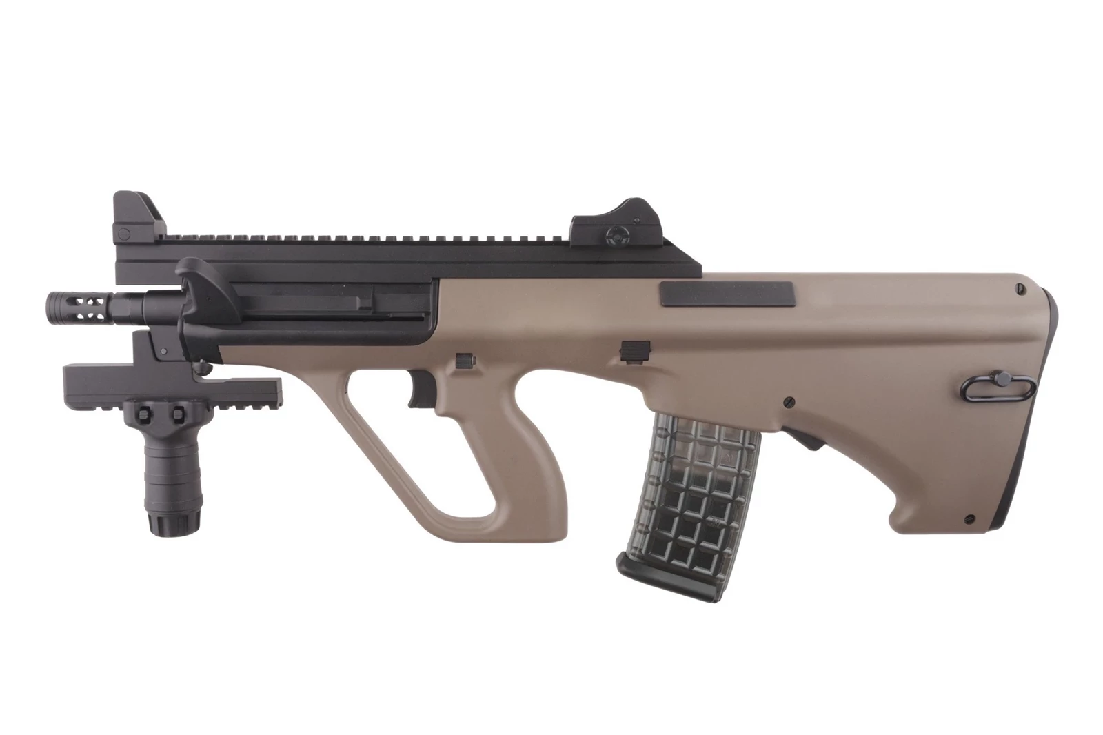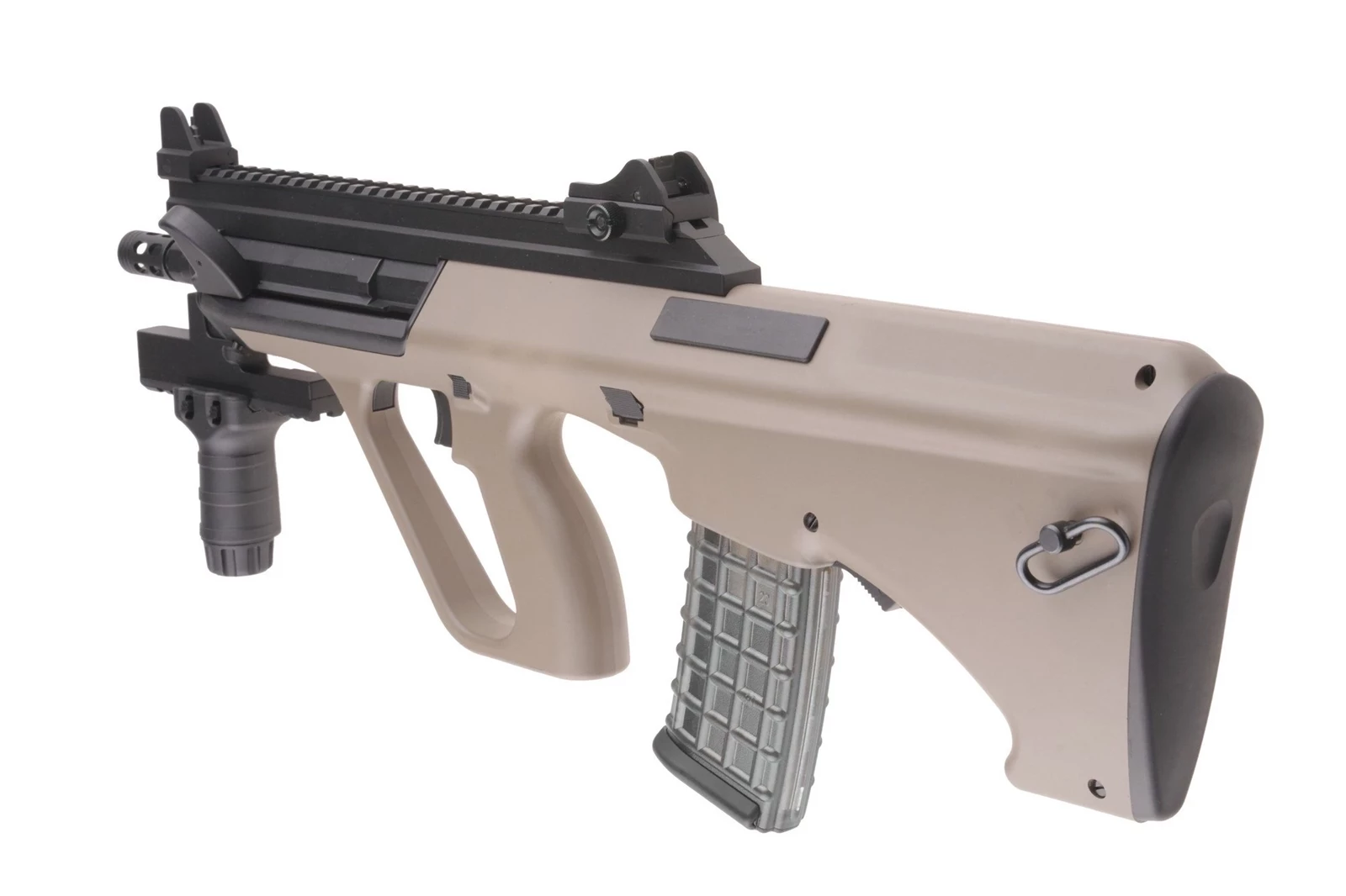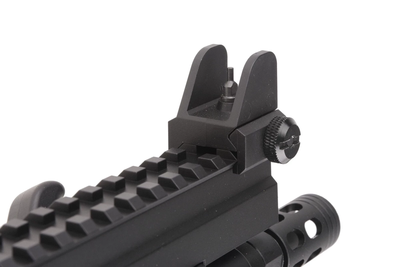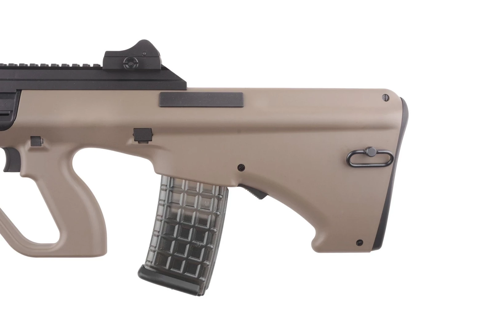 Zarówno w tylnej jak i przedniej części repliki znajdują się metalowe uchwyty do mocowania zawieszenia taktycznego. Dostęp do pokrętła regulacji systemu hop up uzyskujemy standardowo, po odciągnięciu rączki przeładowania i odsłonięcia tym samym okna wyrzutnika łusek. Rączkę można zablokować w tylnej pozycji. Co charakterystyczne dla tej konstrukcji okna wyrzutnika znajdują się po obu stronach dzięki czemu wygodny dostęp będzie miał też użytkownik leworęczny.  Tłumik płomienia został osadzony na 14mm, lewoskrętnym gwincie.