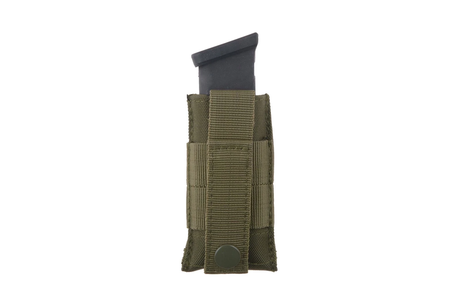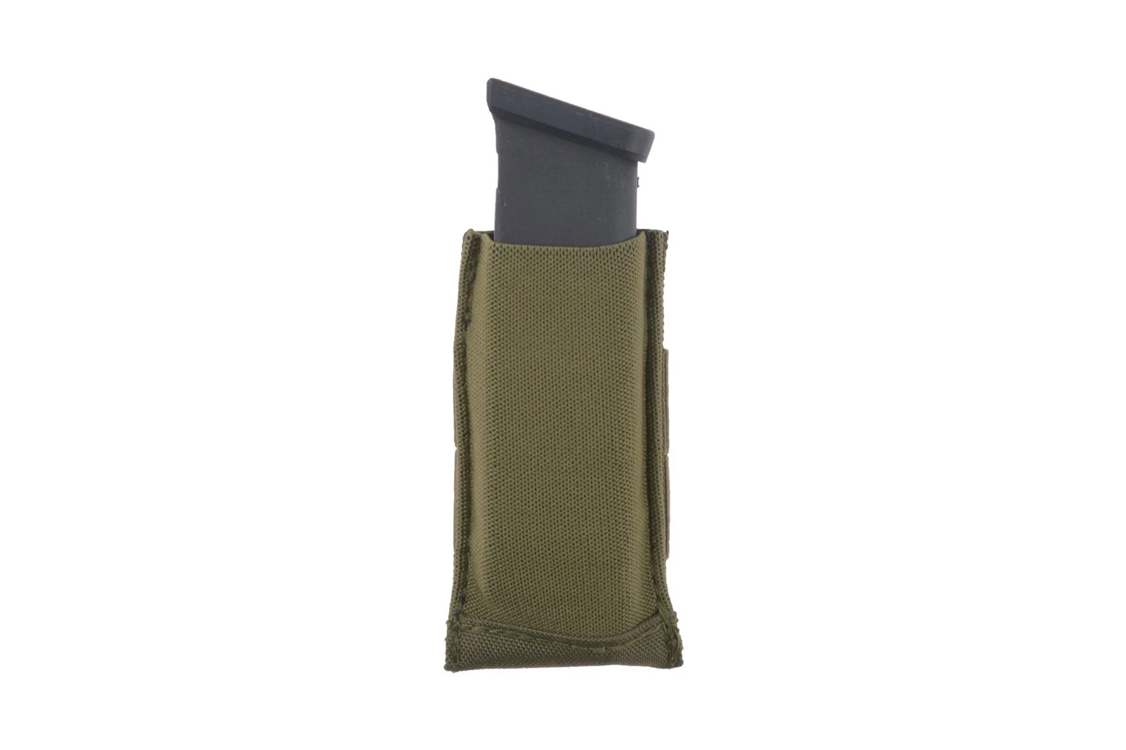 Wykonana z wytrzymałego nylonu ładownica typu speed na 1 magazynek pistoletowy. Wykonana w części z elastycznego materiału pozwala na błyskawiczne dobycie magazynka a także znacznie ogranicza ciężar i miejsce na oporządzeniu. Ładownica mocowana jest na oporządzeniu dzięki systemowi MOLLE.