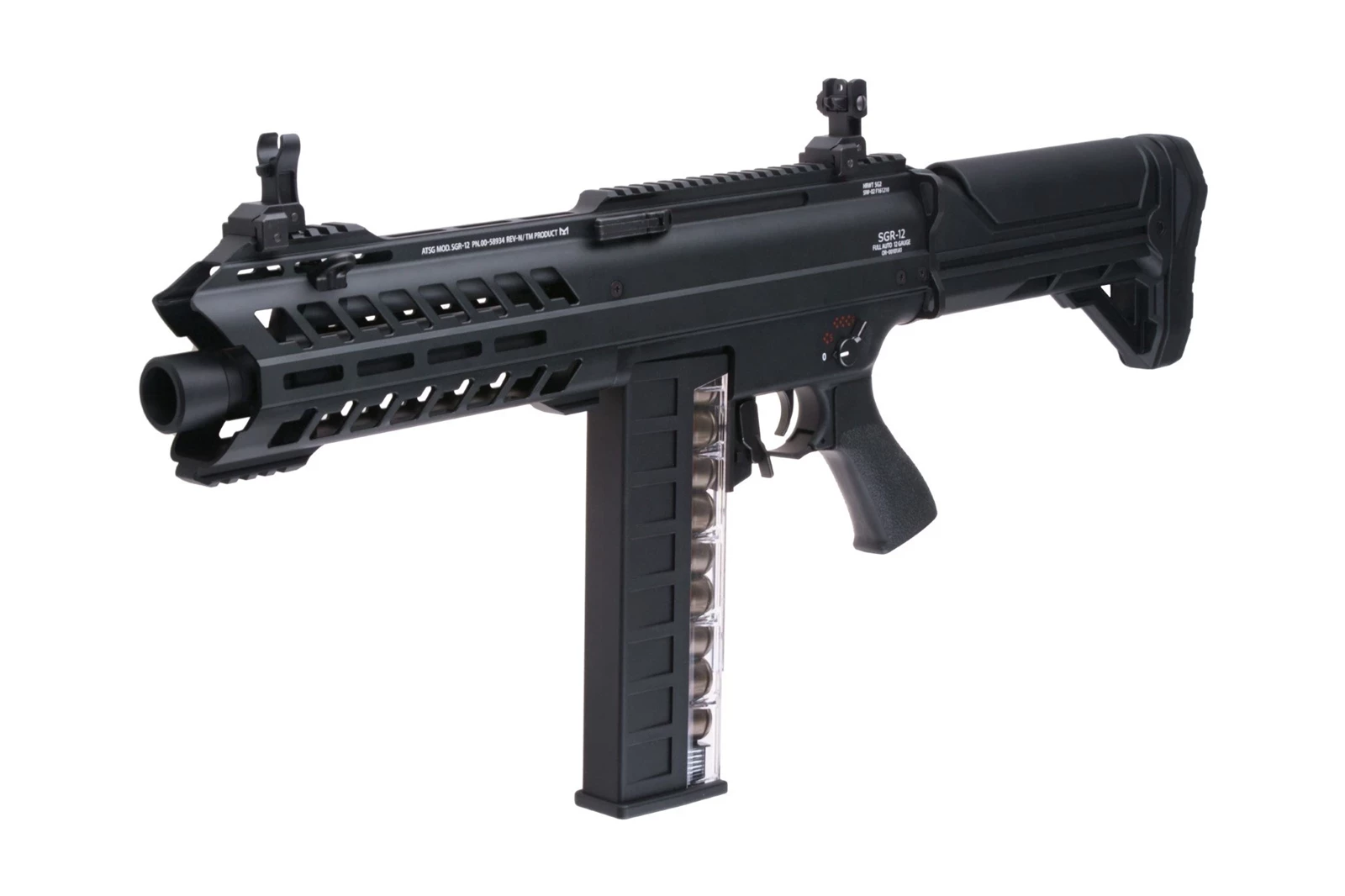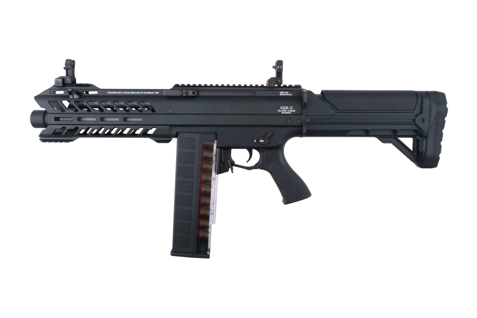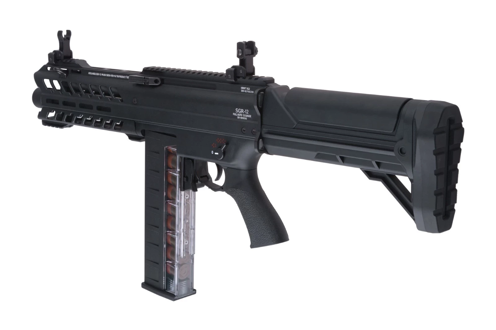 Wyprodukowana przez Tokyo Marui replika SGR-12 jest odmienioną wersją repliki tego samego producenta - AA-12. Wykonany z trwałego, polimerowego tworzywa sztucznego oraz metalu korpus kryje szkielet i części wewnętrzne, które wykonane są metalowe. Wyraźne i dokładne wykończenie repliki zapewniają jej wyjątkowy i bardzo autentyczny wygląd. Wyprodukowana przez znaną z precyzji i innowacyjności Tokyo Marui replika jest uważana za najskuteczniejsze narzędzie do czyszczenia pomieszczeń. Istotnym faktem jest iż replika posiada szynę RIS w standardzie MLOK z oznaczeniami licencyjnymi a także szynę RIS 22mm umieszczoną na grzbiecie repliki oraz pod lufą - pozwala to na instalację rożnej maści akcesoriów taktycznych jak latarki czy celowniki. W zestawie znajdują się 3, różnej długości, dedykowane szyny MLOK które ustawić możemy wedle referencji i zapotrzebowania. Replikę wyposażono także w składane przyrządy celownicze.