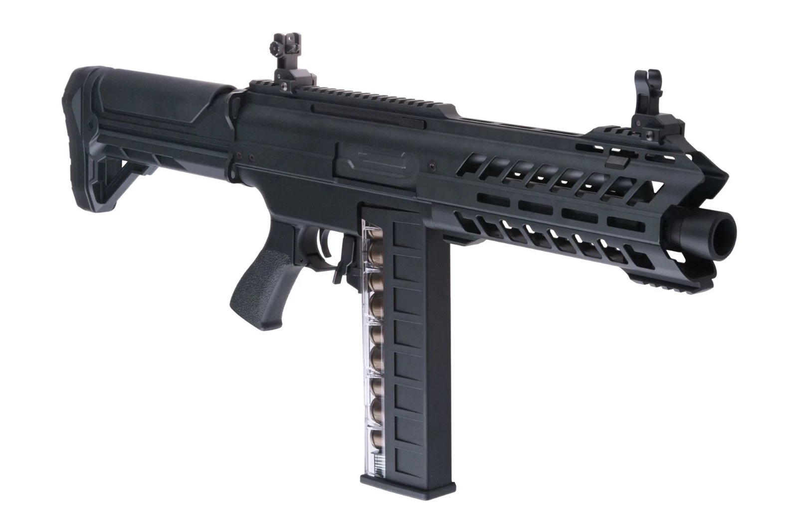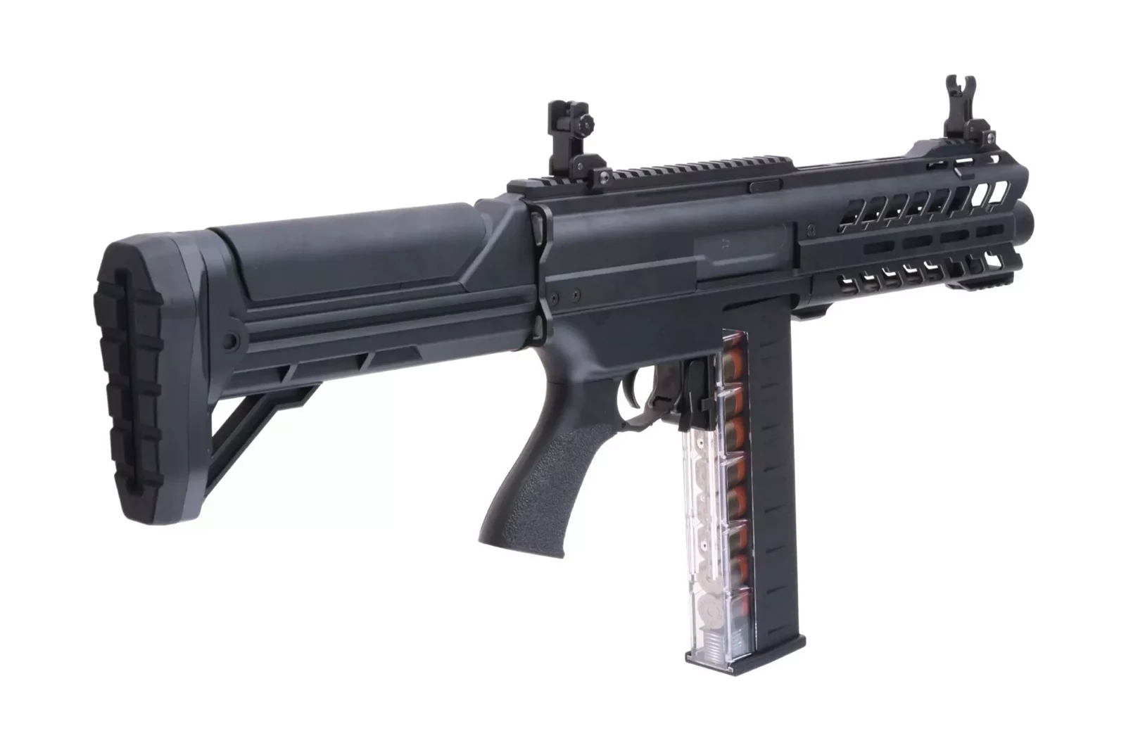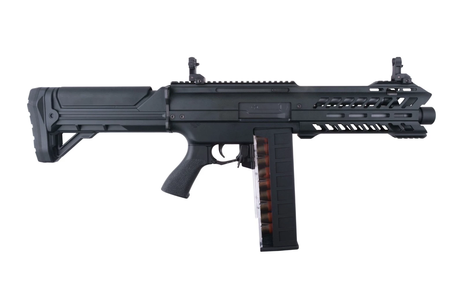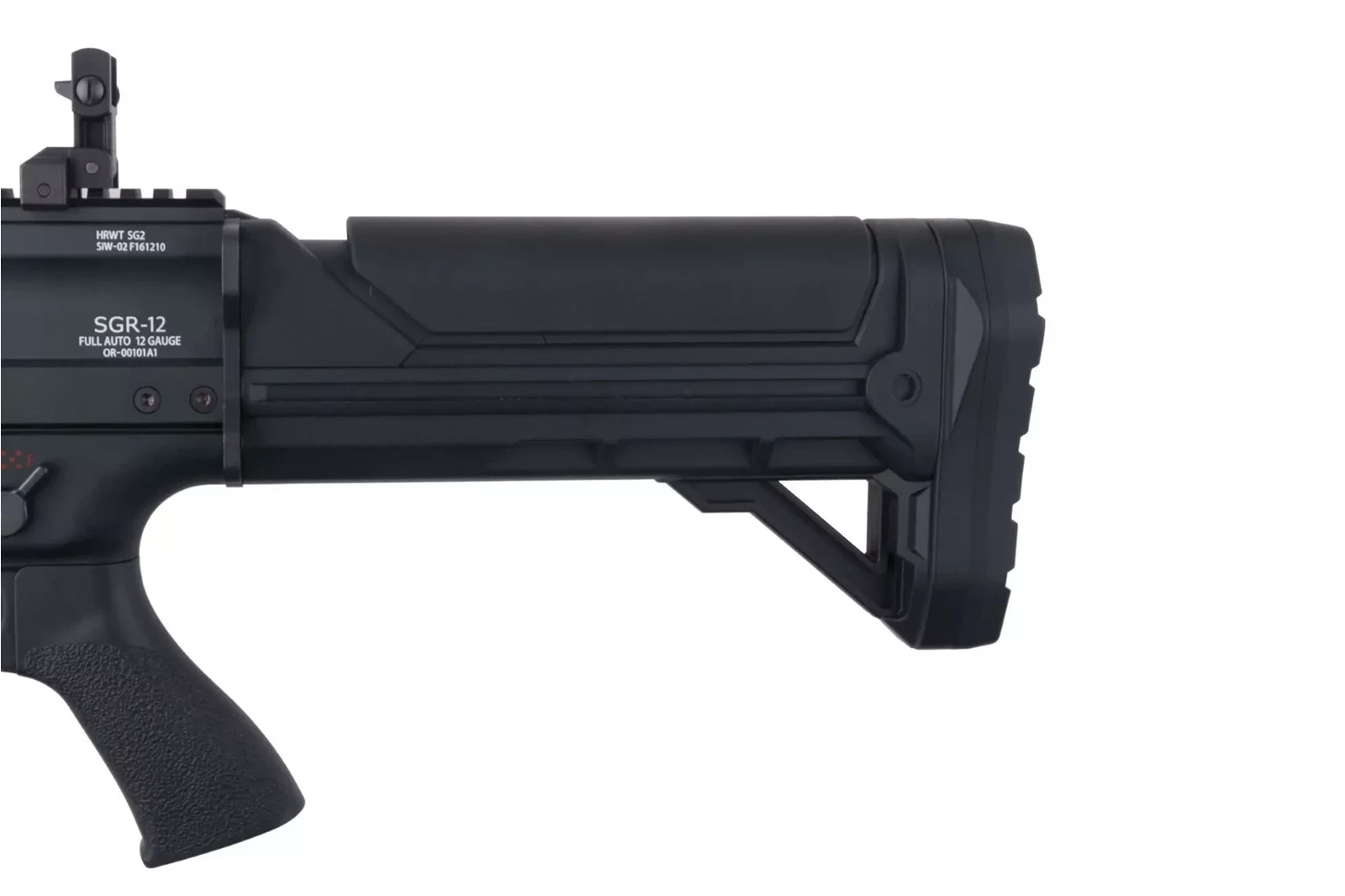 Wyprodukowana przez Tokyo Marui replika SGR-12 jest odmienioną wersją repliki tego samego producenta - AA-12. Wykonany z trwałego, polimerowego tworzywa sztucznego oraz metalu korpus kryje szkielet i części wewnętrzne, które wykonane są metalowe. Wyraźne i dokładne wykończenie repliki zapewniają jej wyjątkowy i bardzo autentyczny wygląd. Wyprodukowana przez znaną z precyzji i innowacyjności Tokyo Marui replika jest uważana za najskuteczniejsze narzędzie do czyszczenia pomieszczeń. Istotnym faktem jest iż replika posiada szynę RIS w standardzie MLOK z oznaczeniami licencyjnymi a także szynę RIS 22mm umieszczoną na grzbiecie repliki oraz pod lufą - pozwala to na instalację rożnej maści akcesoriów taktycznych jak latarki czy celowniki. W zestawie znajdują się 3, różnej długości, dedykowane szyny MLOK które ustawić możemy wedle referencji i zapotrzebowania. Replikę wyposażono także w składane przyrządy celownicze.