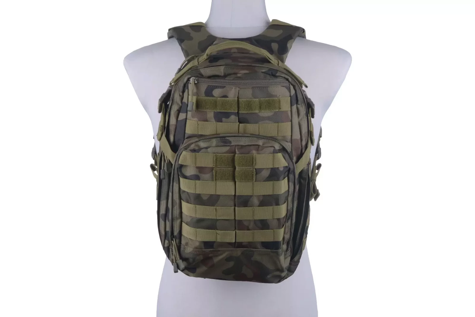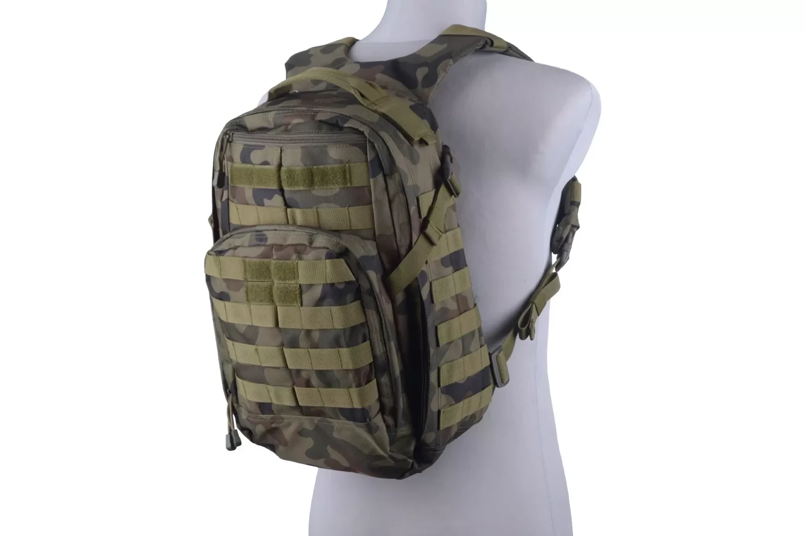 Uniwersalny plecak taktyczny typu EDC, który sprawdzi się zarówno na airsoftowym polu walki, jak i w codziennym użytkowaniu miejskim, czy na wypadzie turystycznym. Uszyty z wytrzymałego nylonu. Główna komora plecaka otwiera się na całej wysokości niczym walizka, co ułatwia pakowanie. Wewnątrz znajdziemy kieszeń na wkład hydratacyjny z zaczepami do jego zamocowania, a także dwie dodatkowe kieszenie siatkowe. Ponadto plecak posiada płaską kieszeń na plecach z wkładem usztywniającym.