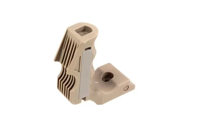 Chwyt został wykonany z wytrzymałego tworzywa sztucznego. Pasuje do replik wyposażonych w szyny montażowe systemu KEYMOD. Po bokach znajdują się punkty mocowania przycisku żelowego latarki lub wskaźnika laserowego.