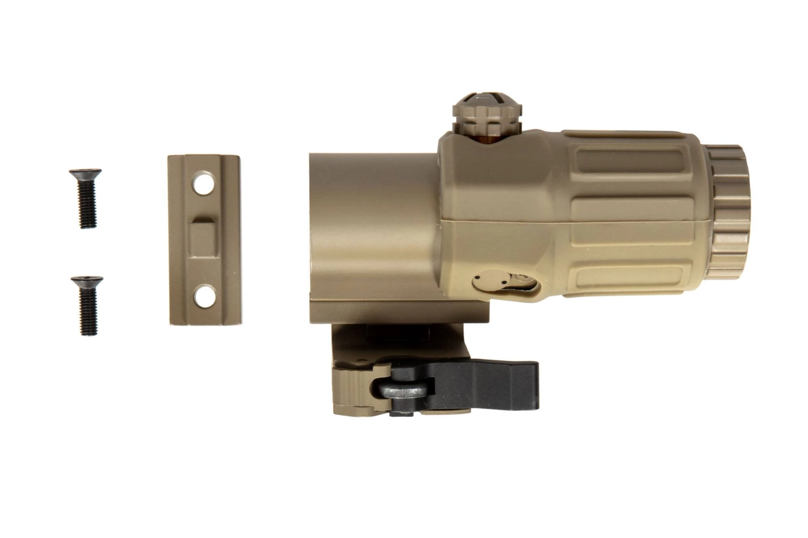 Magnifier osadzony jest na zawiasie zawiasem, co umożliwia na odchylenie go na bok gdy nie jest używany. Średnica 30mm zapewnia kompatybilność z różnymi typami celowników kolimatorowych.