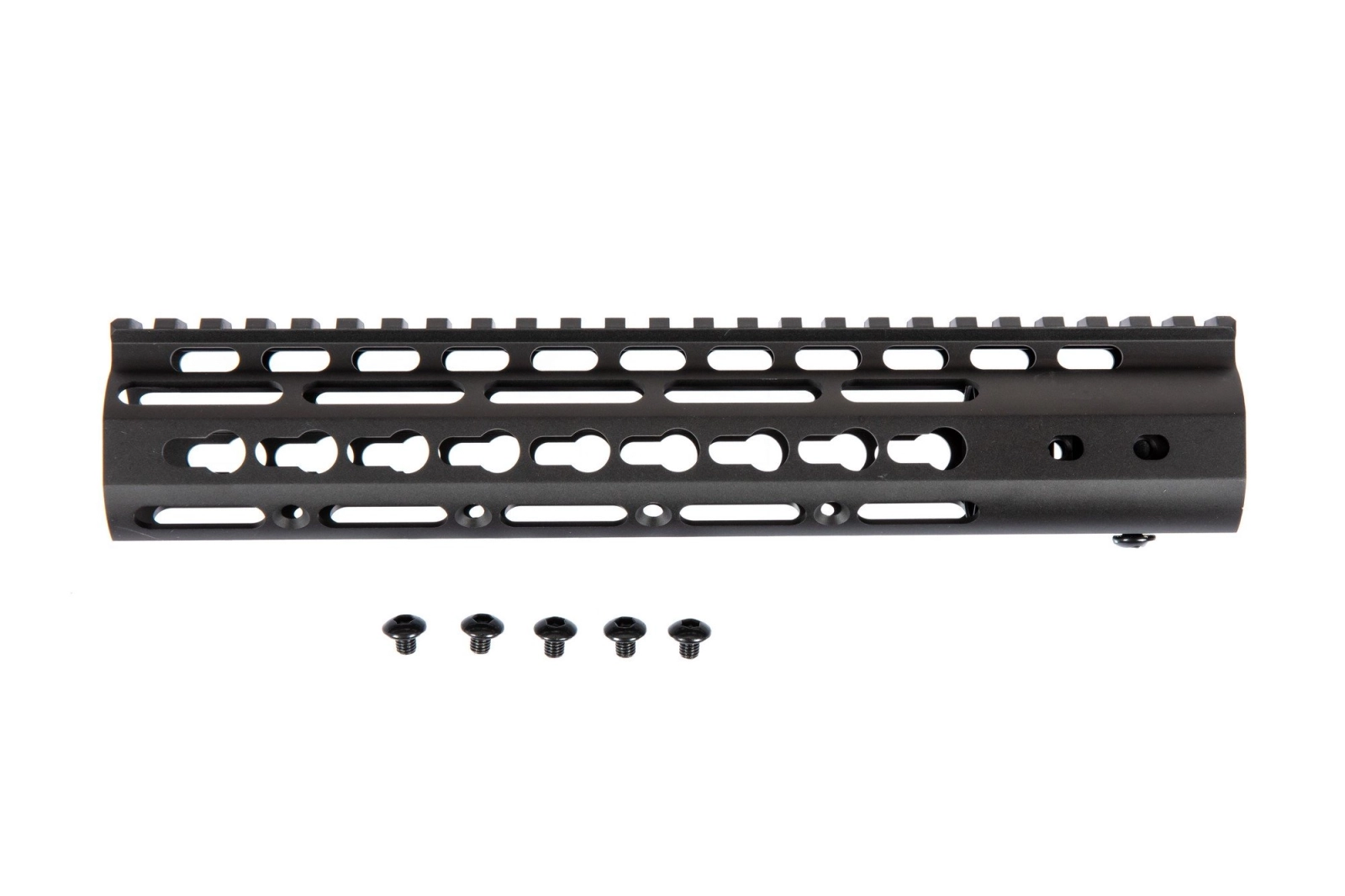 Wykonana z wysokiej jakości aluminium obrabianego na precyzyjnych maszynach CNC frontowa szyna RIS z systemem montażowym KeyMod 10" o długości 255mm. Szyna przeznaczona jest do montażu w replikach typu M4/M16.