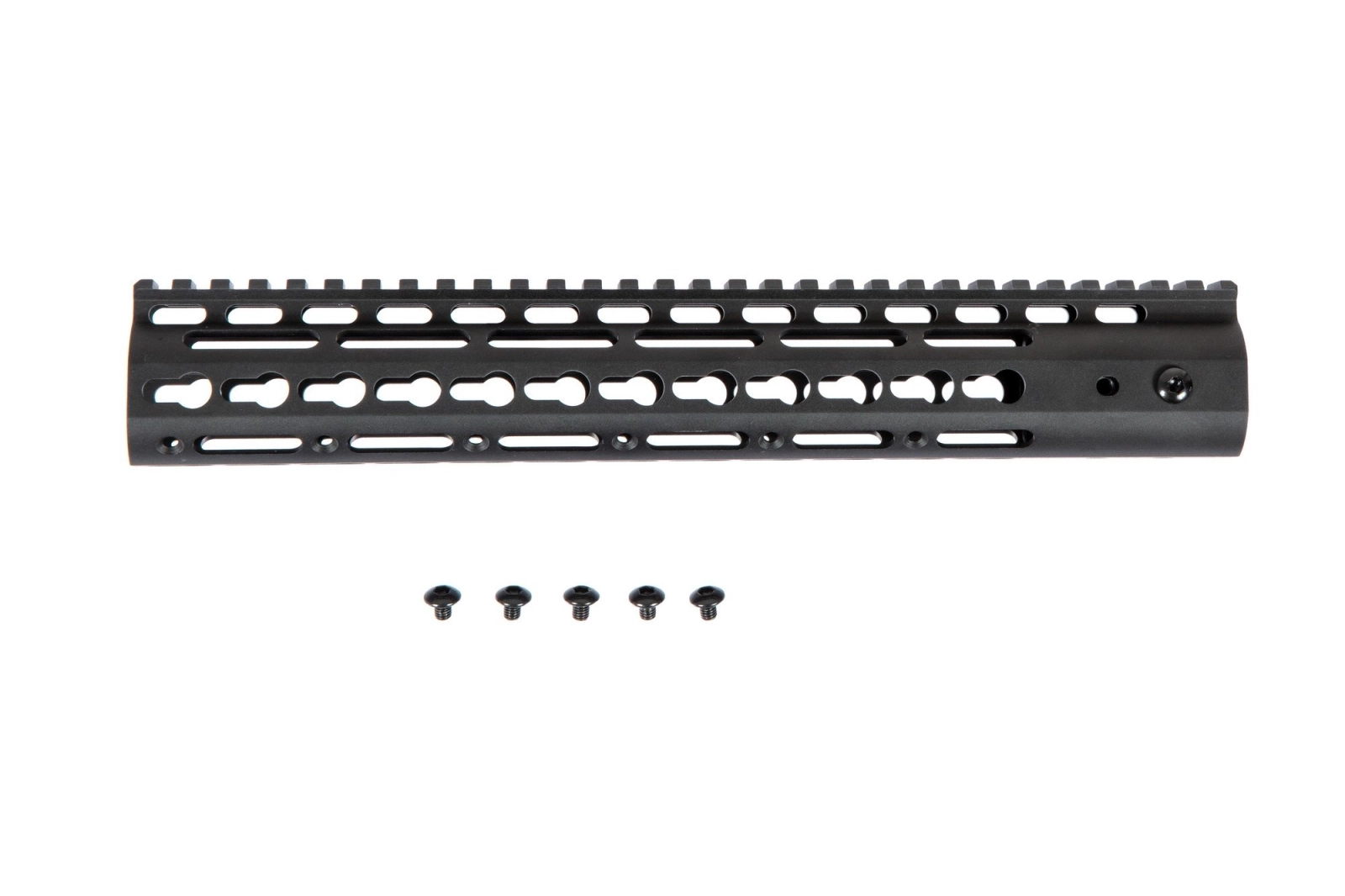 Wykonana z wysokiej jakości metalu frontowa szyna montażowa RIS z systemem montażowym KeyMod 12" o długości 305mm. Szyna przeznaczona jest do montażu w replikach typu M4/M16. W zestawie znajdują się wszystkie potrzebne do montażu śruby.