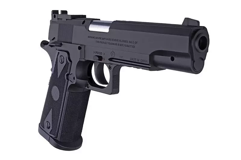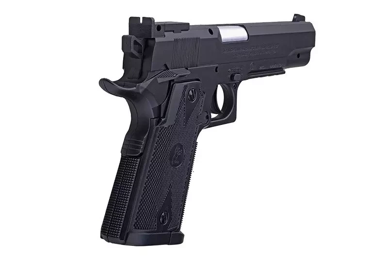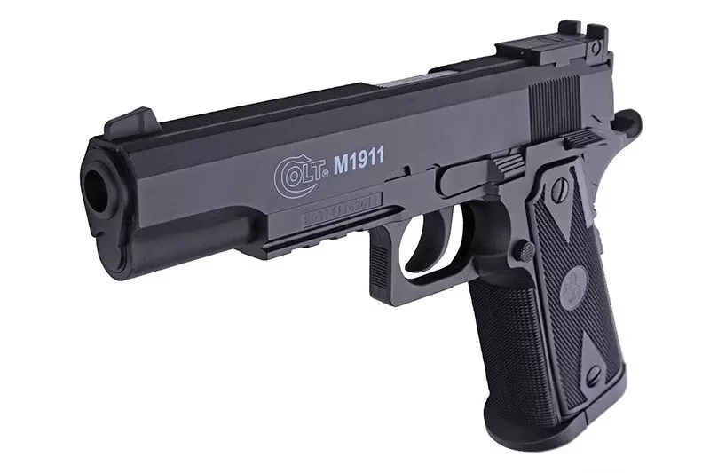 Licencjonowana replika pistoletu Colt 1911 wykonana z mocnego tworzywa sztucznego. Świetna dla młodszych, bądź początkujących zapaleńców airsoftowego hobby. Zastosowanie antypoślizgowej rękojeści zwiększa pewność i wygodę chwytu. Z metalu wykonano niektóre elementy wewnętrzne oraz magazynek.Replika posiada mechaniczne przyrządy celownicze.