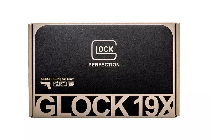 Gazowa replika najnowszego modelu pistoletu marki Glock - Glock 19X. Wykonana została z metalu oraz tworzywa sztucznego. Korpus pistoletu wykonany został z tworzywa sztucznego natomiast zamek, lufa zewnętrzna oraz magazynek z metalu. Na pistolet oraz magazynek naniesione zostały licencjonowane oznaczenia producenta Glock.