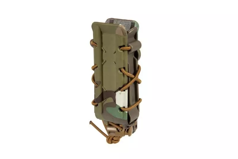 Wykonana z wytrzymałego tworzywa sztucznego ładownica typu fast mieszcząca jeden magazynek pistoletowy 9mm. Ładownica wyposażona jest w specjalną elastyczną linkę do regulacji "rozwarcia" ładownicy która lepiej dopasowuje się do zawartości i nie pozwala magazynkom wypaść. Ładownicę zamontować można na pasie o maksymalnej szerokości 50mm. W zestawie znajduje się klasyczny montaż MOLLE oraz dodatkowy, wygodny i stabilny montaż na pas.