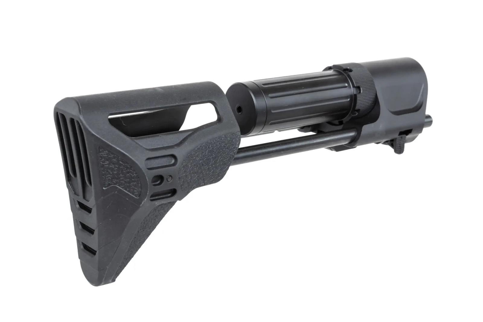 Kolba posiada podwójną blokadę, która uniemożliwia przypadkowe wysunięcie kolby z korpusu. Do odkręcanej atrapy buffer tube można zmieścić akumulator LiPo o wymiarach maksymalnych 15x11x115mm. Przykładowy akumulator: https://gunfire.com/pl/products/akumulator-lipo-7-4v-1200mah-25-50c-t-connect-deans-1152214387.html