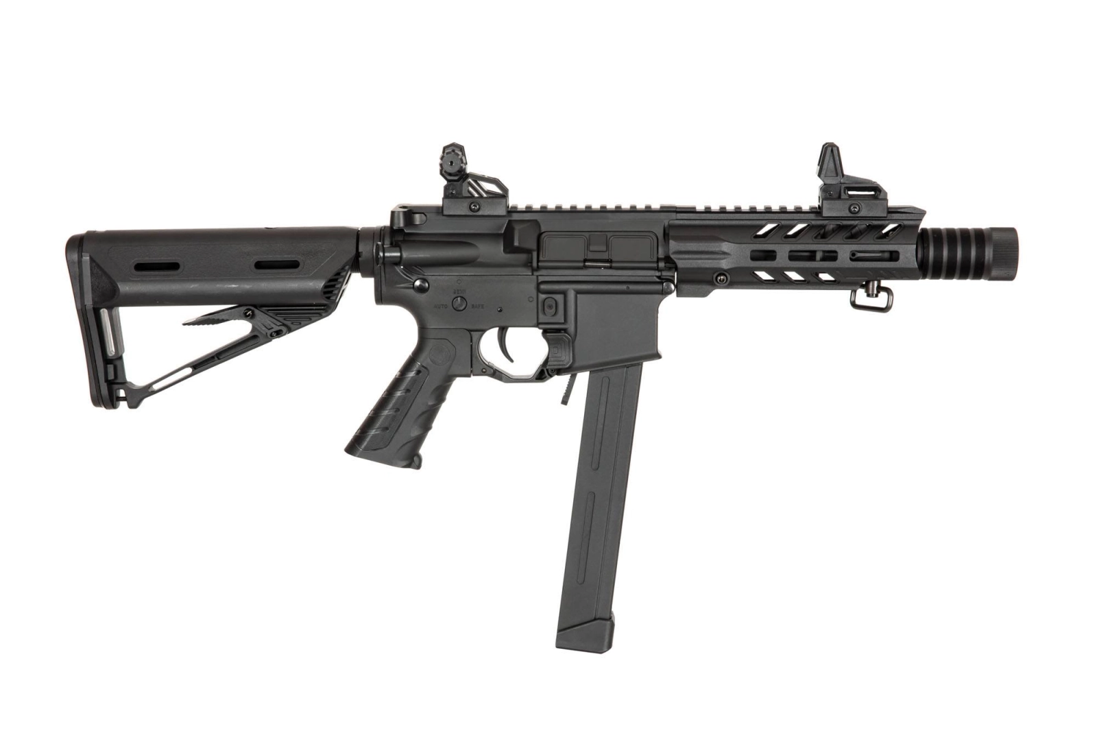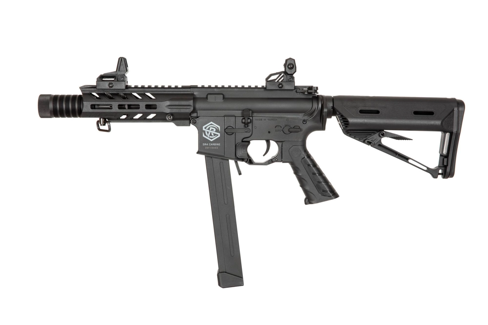 SR4 FALCON-W to lekka i kompaktowa replika pistoletu maszynowego AEG. Większość elementów (w tym korpus) wykonano z wzmocnionego tworzywa nylonowego. Zewnętrzne części metalowe to lufa, prowadnica kolby, urządzenie wylotowe, klapka wyrzutnika łusek oraz manipulatory.