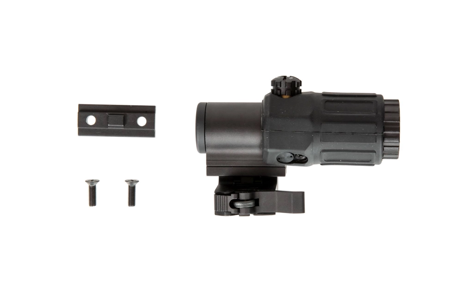 Przystawka powiększająca firmy JJ Airsoft z obudową wykonaną w całości z metalu, dedykowana do współpracy z celownikami kolimatorowymi Luneta posiada stałe powiększenie x3 oraz szybki montaż QD na standardową szynę 22mm RIS. Dzięki mocowaniu na zawiasie (pivot) mamy możliwość błyskawicznego odchylenia przystawki / przejścia w tryb powiększania w miarę dynamicznie zmieniających się warunków na polu gry.