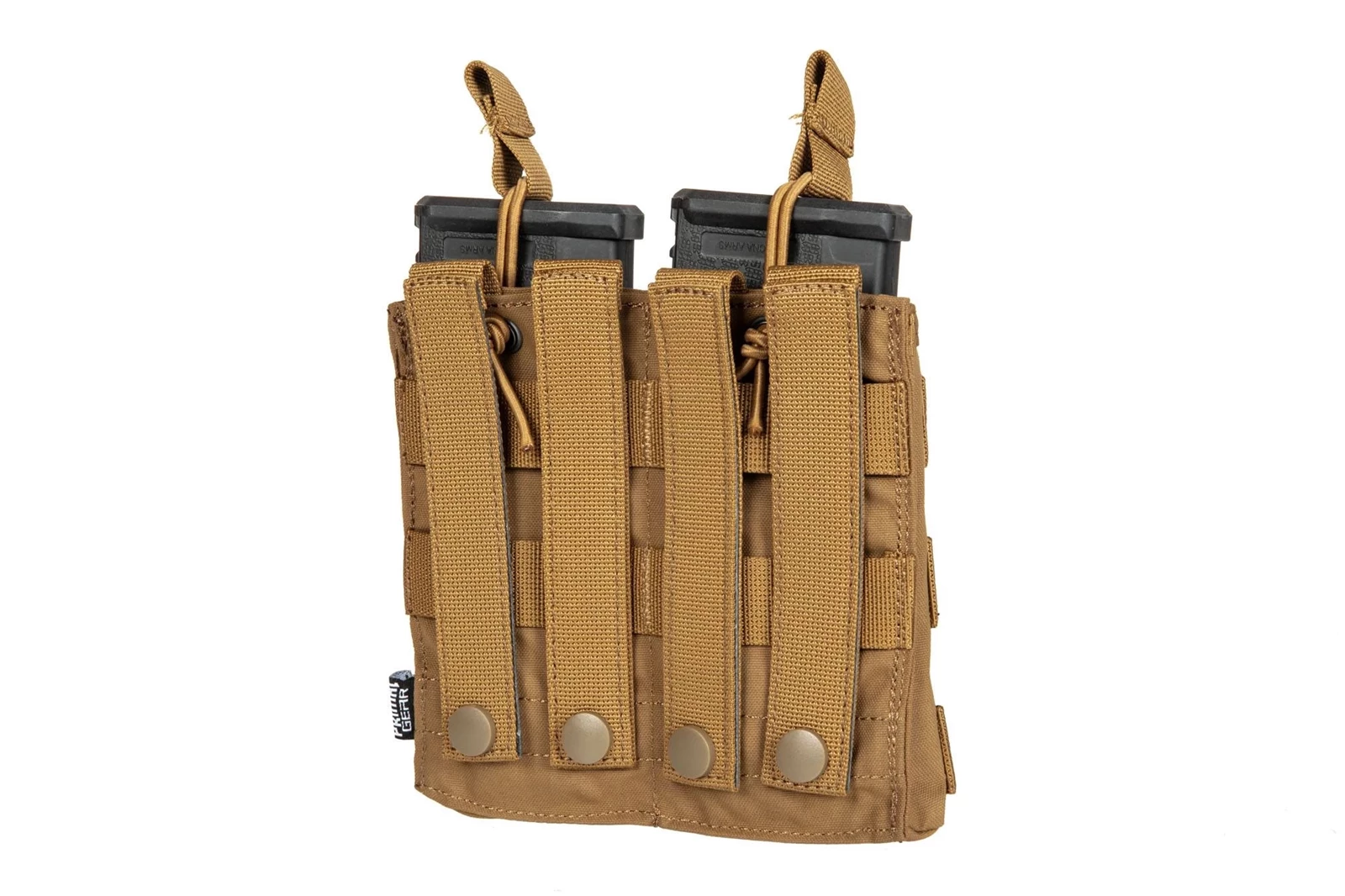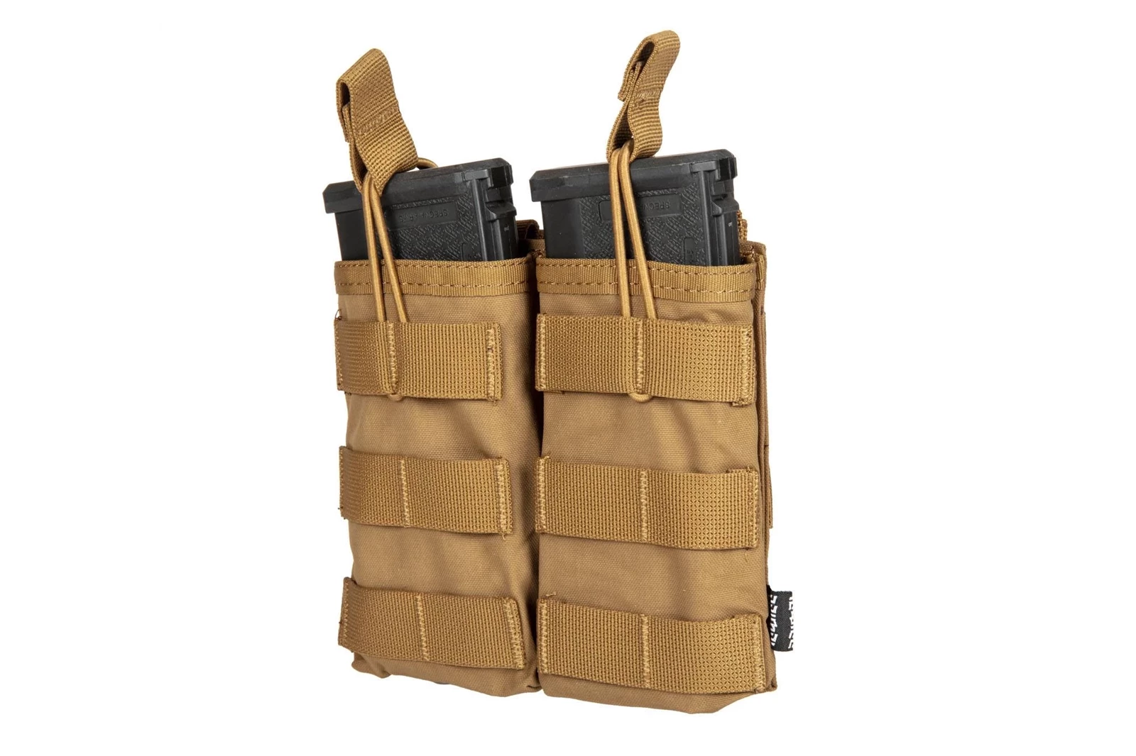 Wykonana z lekkiego i wytrzymałego materiału Aspen 500D ładownica typu shingle na 2 magazynki typu AK / M4 / G36 oraz wiele innych. Zastosowanie wytrzymałych szwów oraz wysokiej jakości akcesoriów jak taśmy dodatkowo zwiększają odporność i trwałość. Każdy magazynek jest od góry zabezpieczony przed wypadnięciem elastyczną linką typu shock-cord.