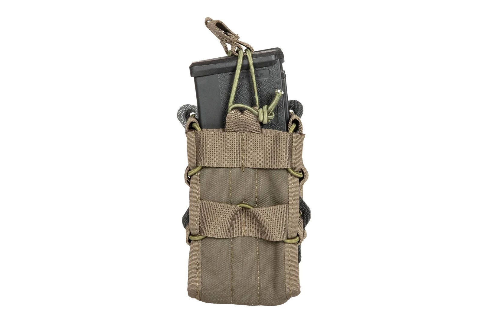 Podwójna ładownica uniwersalna typu shingle na 2 magazynki została wykonana z lekkiego i trwałego materiału Aspen 500D. Zastosowanie wytrzymałych szwów oraz wysokiej jakości akcesoriów jak taśmy dodatkowo zwiększają odporność i trwałość. Dzięki dzięki możliwości regulowania objętości pomieści magazynki typu AK / M4 / G36 / M14 / SR25 oraz wiele innych. Magazynek jest od góry zabezpieczony przed wypadnięciem elastyczną linką typu shock-cord.