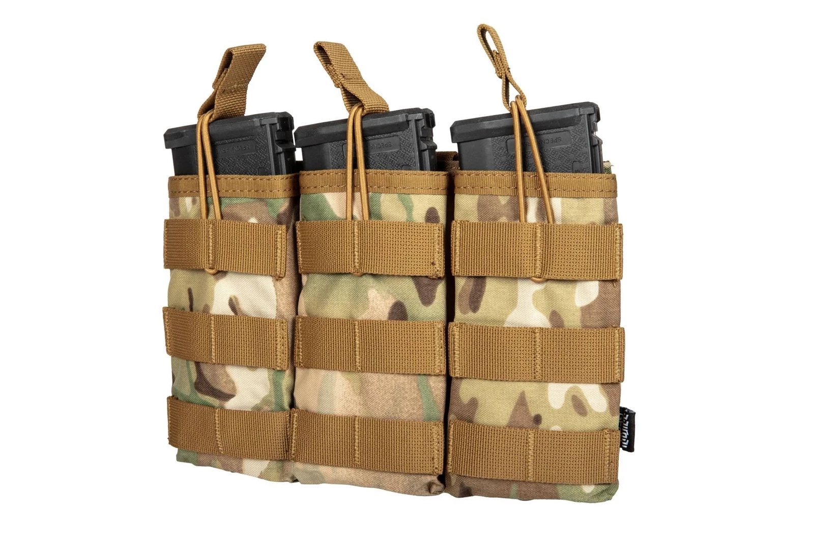 Potrójna ładownica typu shingle na 3 magazynki typu AK / M4 / G36 została wykonana z lekkiej i trwałej Cordury 500D. Zastosowanie wytrzymałych szwów oraz wysokiej jakości akcesoriów jak taśmy i rzepy dodatkowo zwiększają odporność i trwałość. Każdy magazynek jest od góry zabezpieczony przed wypadnięciem elastyczną linką typu shock-cord.