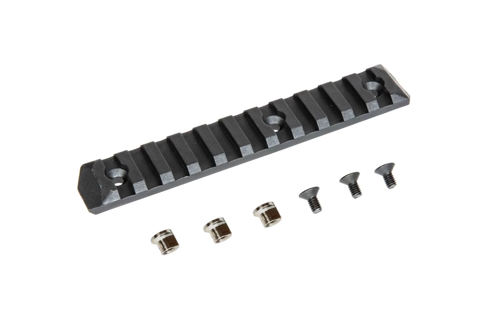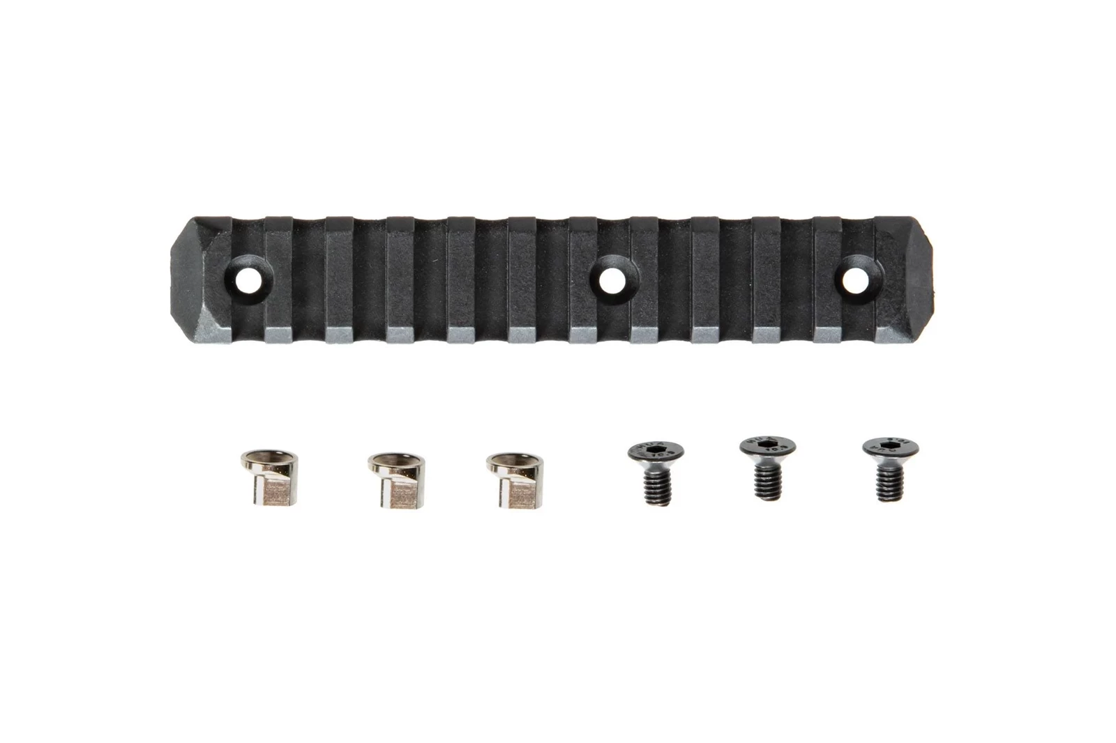 Odcinek szyny RIS / Picatinny o długości 11 slotów wykonany z tworzywa polimerowego. Szyna posiada montaż kompatybilny z systemem modułowym KeyMod.