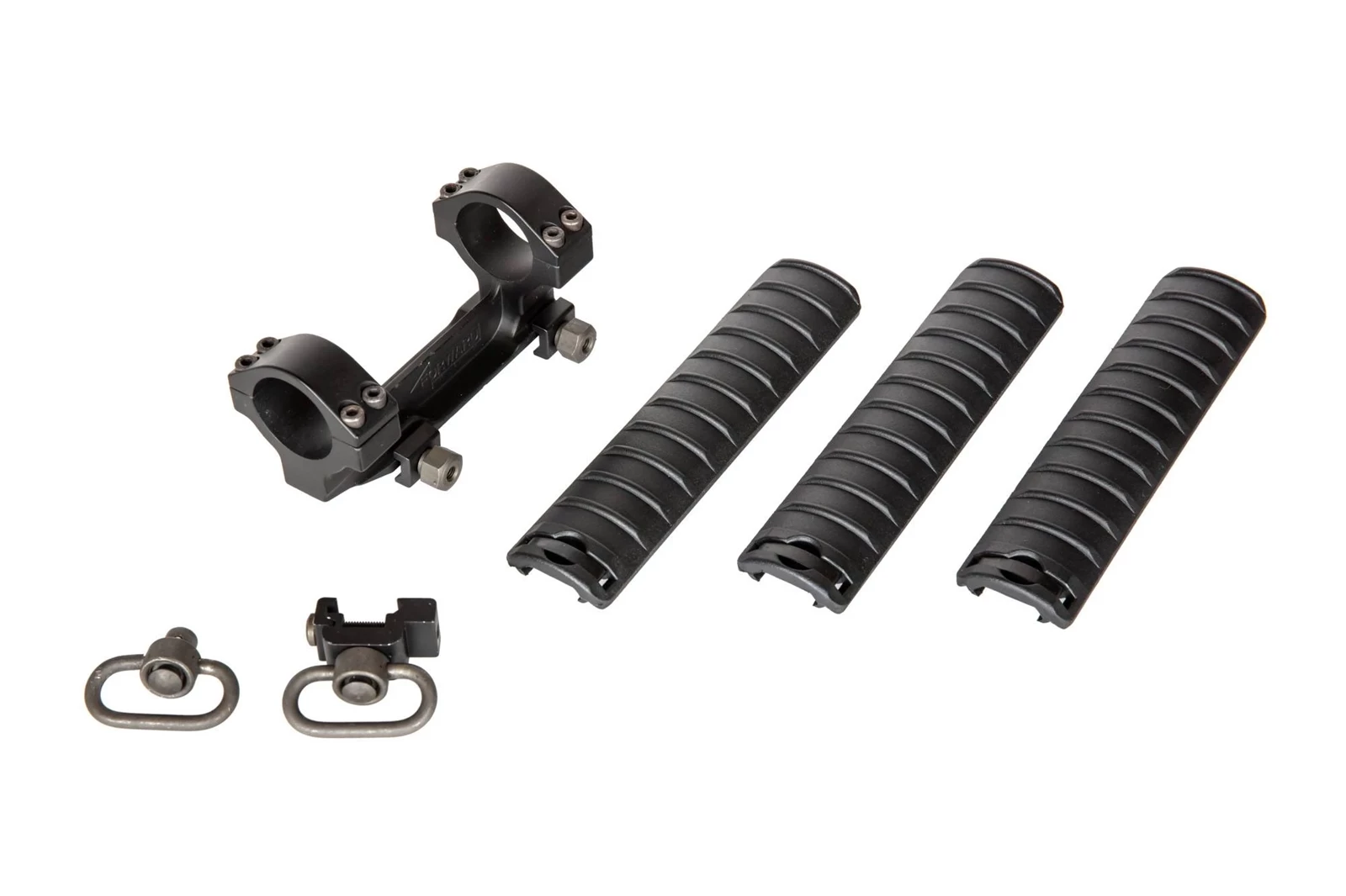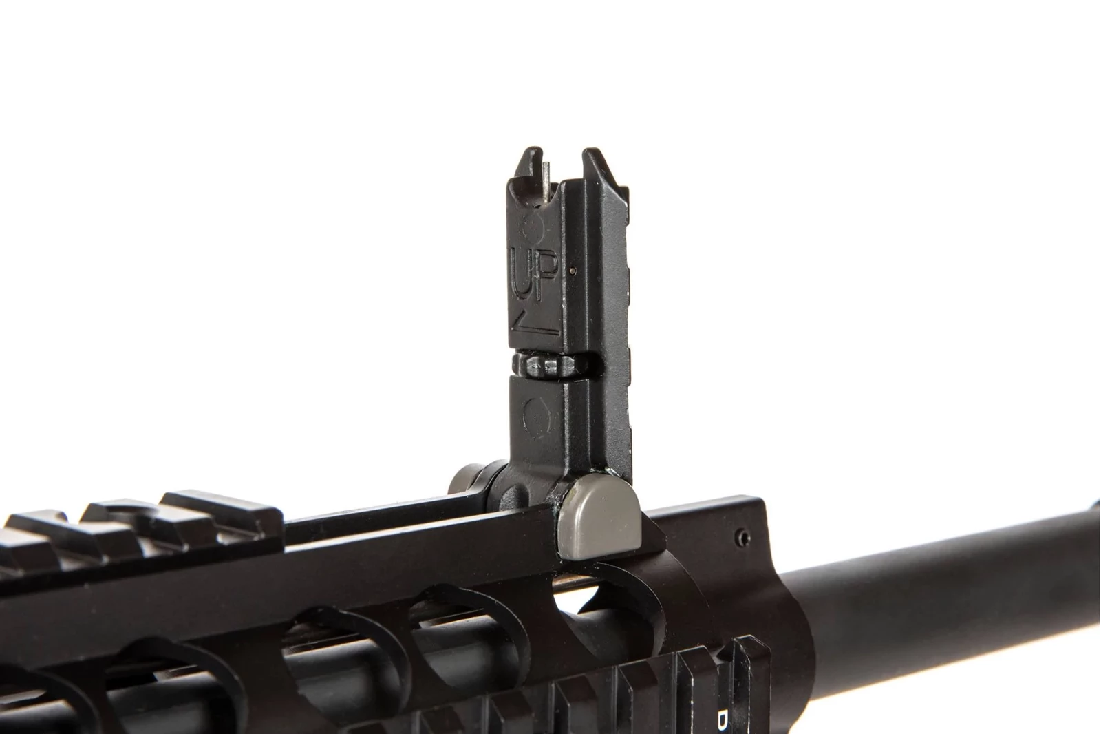 M110 Carbine została wyposażona w zespół frontowych szyn typu free float. Dzięki szynom montażowym RIS 22mm, w tym jednej długiej, grzbietowej, mamy możliwość instalacji całej gamy akcesoriów dodatkowych, począwszy od celowników optycznych, aż po oświetlenie i chwyty taktyczne. W komplecie otrzymujemy zestaw 3 paneli ochronnych na wspomniane szyny. Replika posiada 2 mocowania zawieszenia taktycznego typu QD - umożliwiające wypięcie za jednym naciśnięciem. Przedni zaczep montowany jest za pomocą szyny RIS.