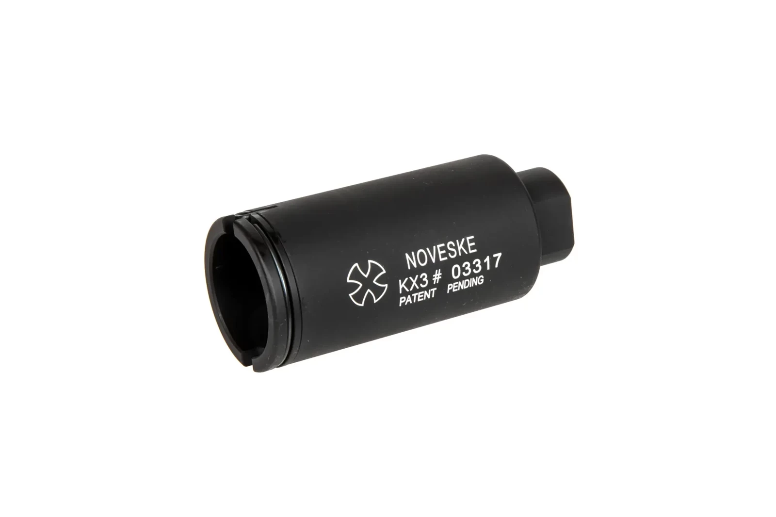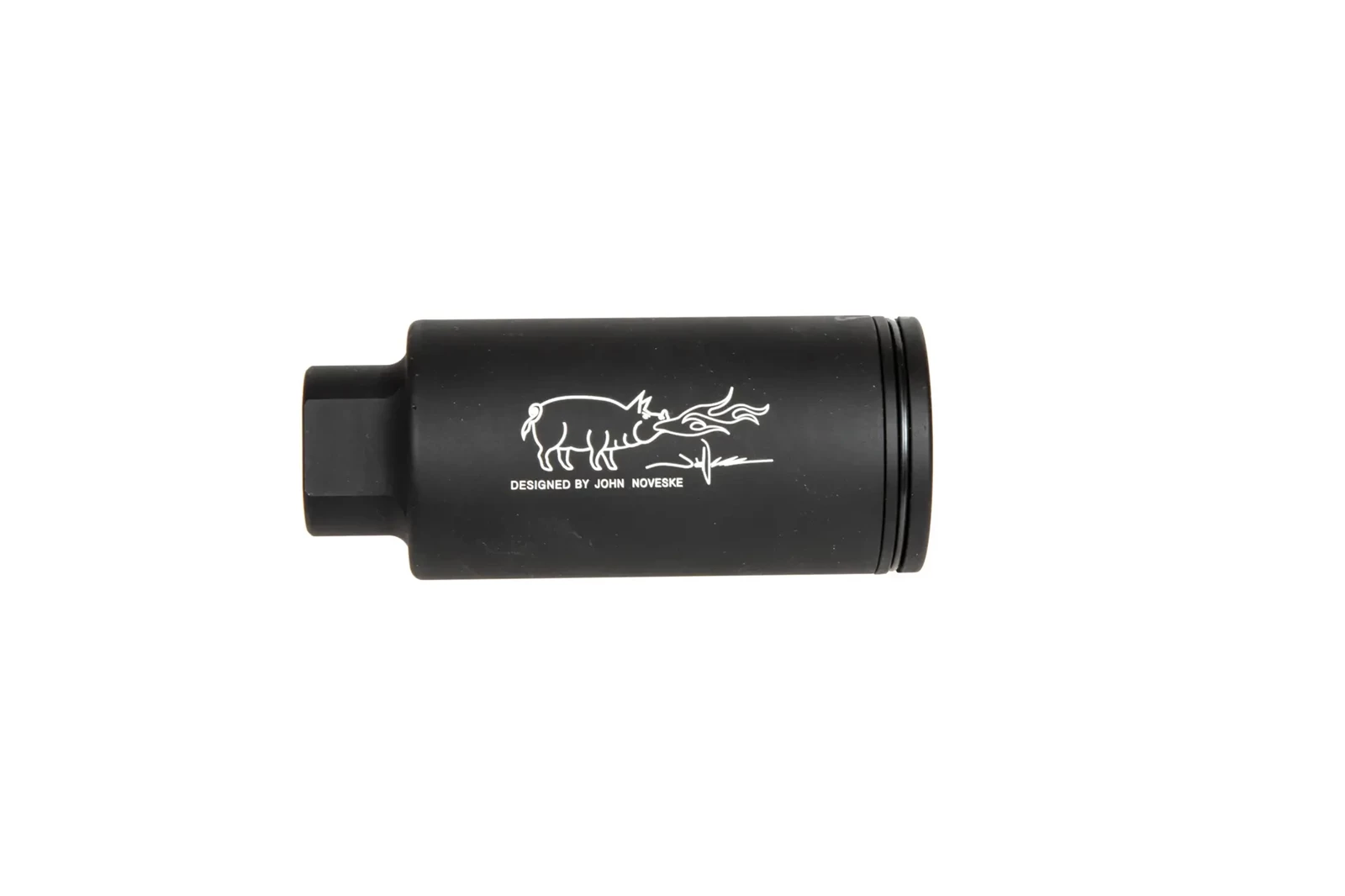 Replika urządzenia wylotowego typu aplifier firmy Madbull z oznaczeniami producenta akcesoriów do broni palnej Noveske®.  Model wzmacnia dźwięk strzału, skupiając wychodzące z lufy powietrze, przez stożkowy wkład w jednym kierunku. Korpus tłumika został wykonany obrabianego numerycznie anodyzowanego aluminium. Wkład nagłaśniający został wykonany z czernionej stali
