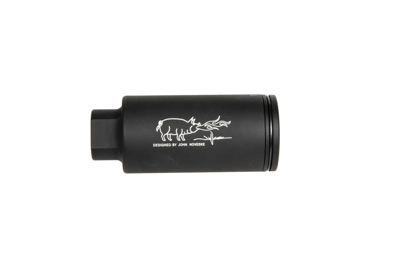 Replika urządzenia wylotowego typu aplifier firmy Madbull z oznaczeniami producenta akcesoriów do broni palnej Noveske®. Model wzmacnia dźwięk strzału, skupiając wychodzące z lufy powietrze, przez stożkowy wkład w jednym kierunku. Korpus tłumika został wykonany obrabianego numerycznie anodyzowanego aluminium. Wkład nagłaśniający został wykonany z czernionej stali.