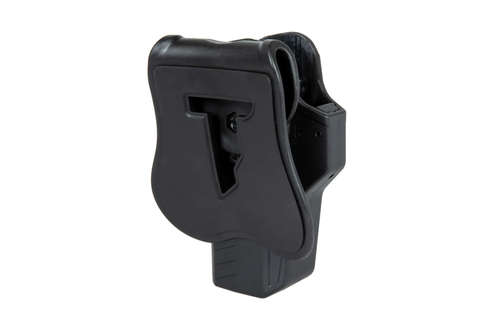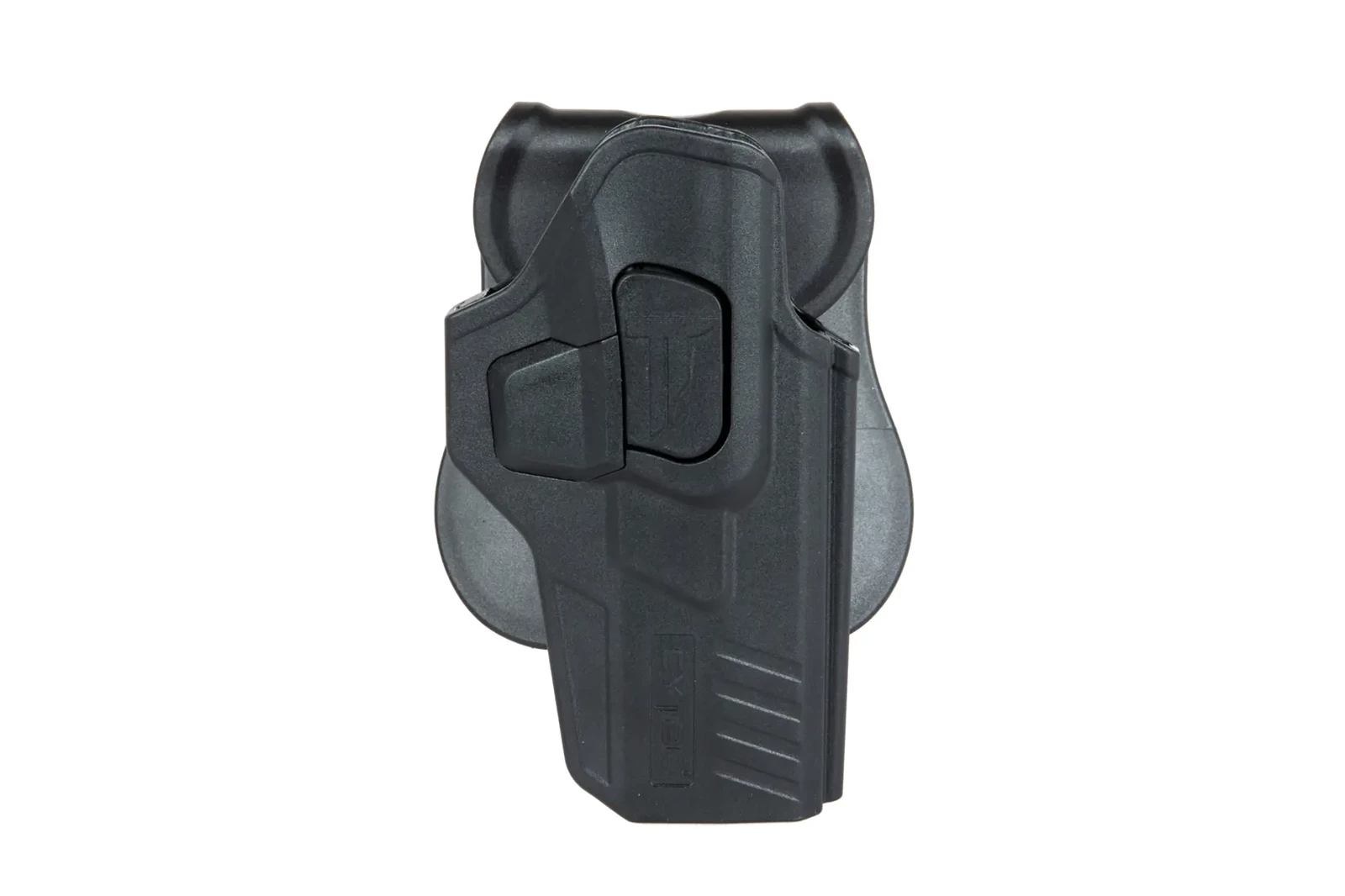 Kabura R-DEFENDER posiada intuicyjny mechanizm szybkiego zwalniania / blokowania, obsługiwany palcem wskazującym. Pistolet jest automatycznie blokowany po odłożeniu do kabury.
