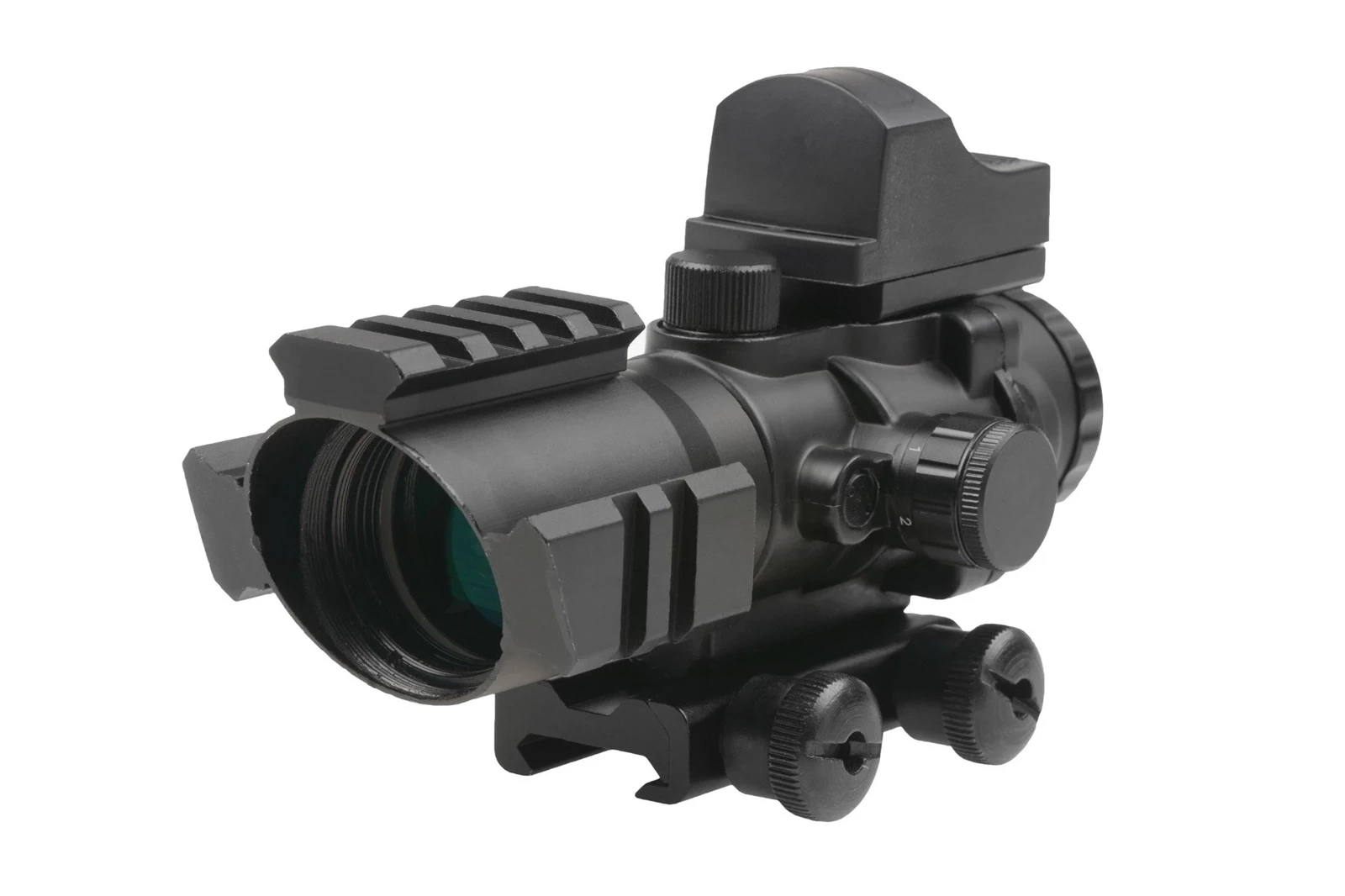 Luneta została wyposażona w krótkie szyny RIS (łącznie 3) do montażu dodatkowych akcesoriów. Na grzbiecie lunety zamontowano w pełni funkcjonalny lekki celownik kolimatorowy typu Micro! Kolimator posiada punkt celowniczy w kolorze zielonym/czerwonym.