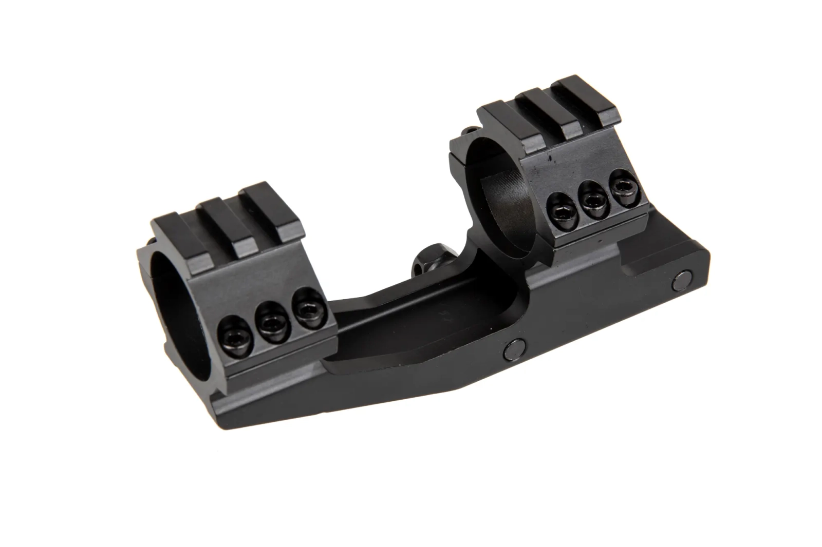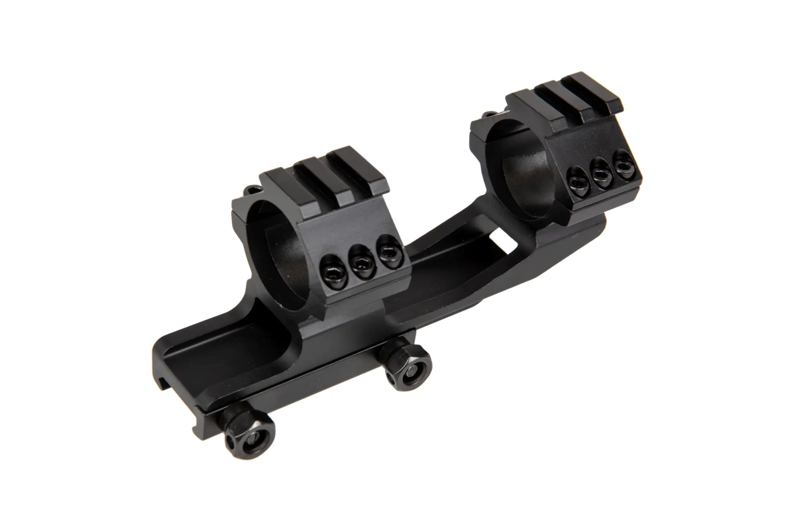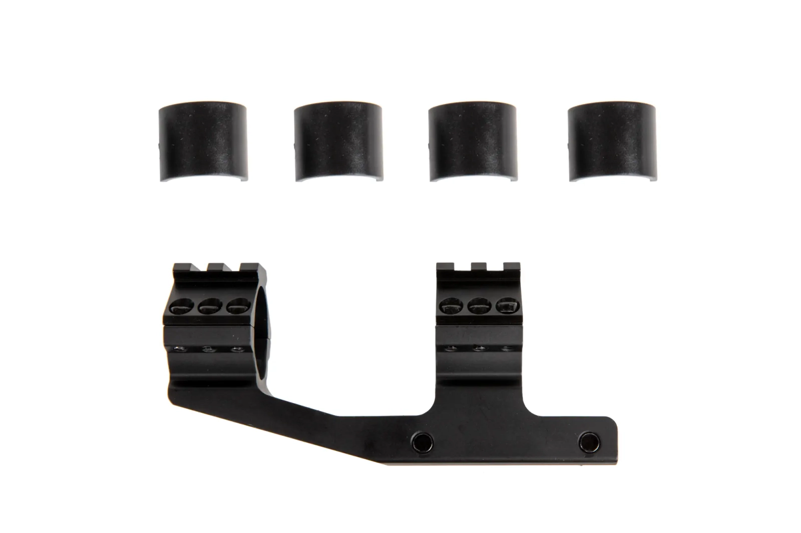 Wykonany z aluminium serii 4, kątowy montaż do lunet. Posiada średnicę wewnętrzną 29mm, którą można zmniejszyć dołączonymi do zestawu polimerowymi wkładkami do 24 mm.