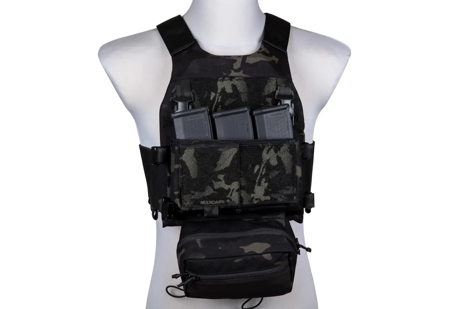 - w zestawie znajduje się panel typu MK Chest Rig wraz z dwoma elastycznymi wkładkami na 3 magazynki typu M4/M16, jedna podwójna wkładka na magazynki SR25, oraz dolna kieszeń cargo (brak szelek w zestawie)