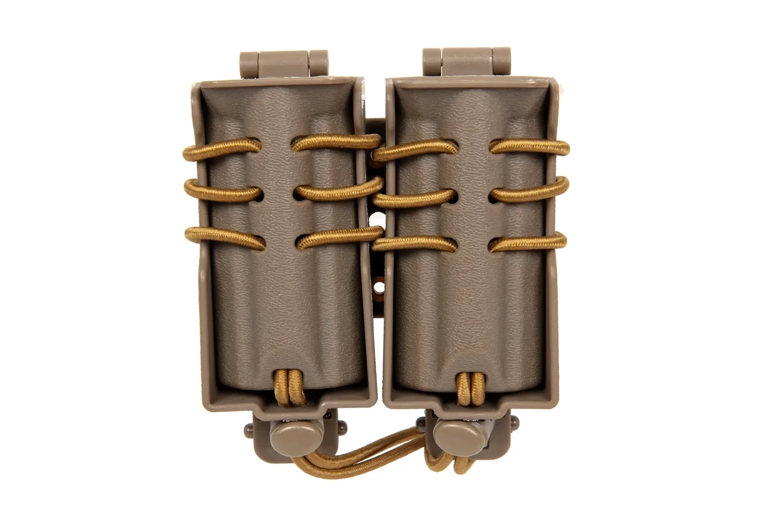 Wykonana z wytrzymałego tworzywa sztucznego ładownica typu fast mieszcząca dwa magazynki 9mm. Ładownica wyposażona jest w specjalną elastyczną linkę do regulacji "rozwarcia" ładownicy która lepiej dopasowuje się do zawartości i nie pozwala magazynkom wypaść. Ładownicę zamontować można na pasie o maksymalnej szerokości 45mm a także na oporządzeniu zgodnym z systemem MOLLE.