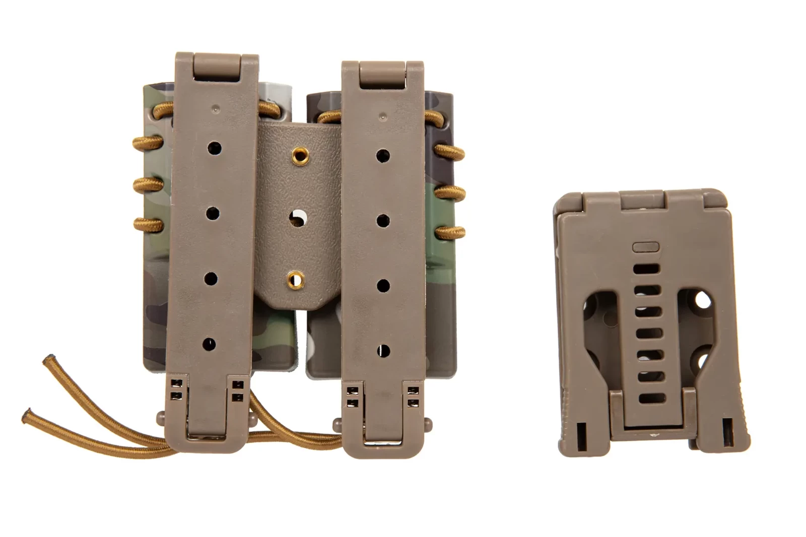 Wykonana z wytrzymałego tworzywa sztucznego ładownica typu fast mieszcząca dwa magazynki 9mm. Ładownica wyposażona jest w specjalną elastyczną linkę do regulacji "rozwarcia" ładownicy która lepiej dopasowuje się do zawartości i nie pozwala magazynkom wypaść. Ładownicę zamontować można na pasie o maksymalnej szerokości 45mm a także na oporządzeniu zgodnym z systemem MOLLE.