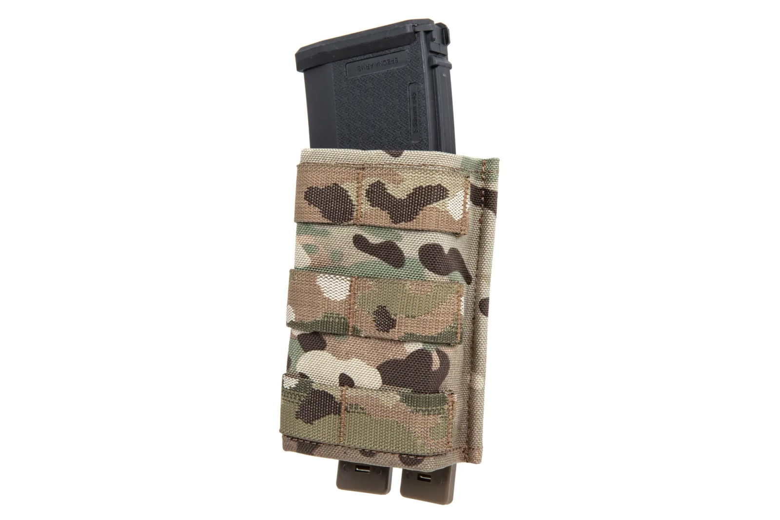 Front ładownicy posiada trzy rzędy taśm w systemie Molle, co pozwoli rozbudować wyposażenie o dodatkowe ładownice, zaczepy lub np. montaż karabińczyka.