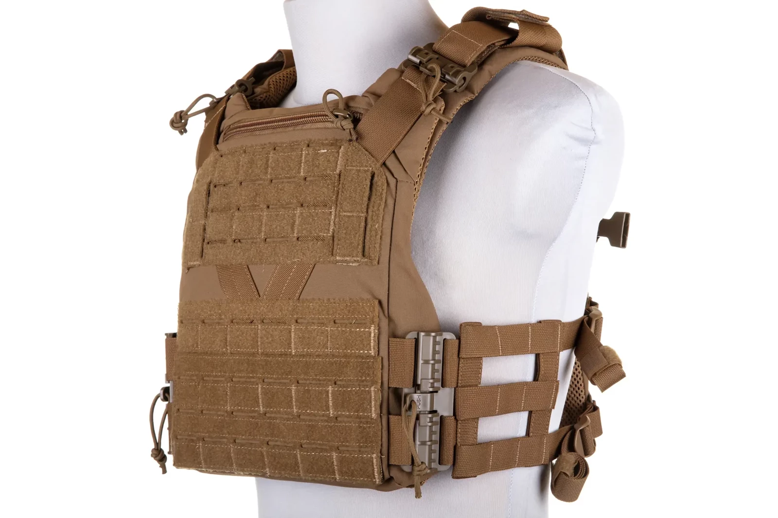 Kamizelka została uszyta z wysokiej jakości Cordury i wyposażona w wysokiej jakości klamry typu QD oraz zamek YKK. Plate carrier składa się z przedniego i tylnego panelu, które są przystosowane do stabilnego przenoszenia twardych wkładów balistycznych SAPI/ESAPI w rozmiarach S, M lub L. Płyty balistyczne wsuwane są do kieszeni od spodu i dodatkowo zabezpieczone na rzep.