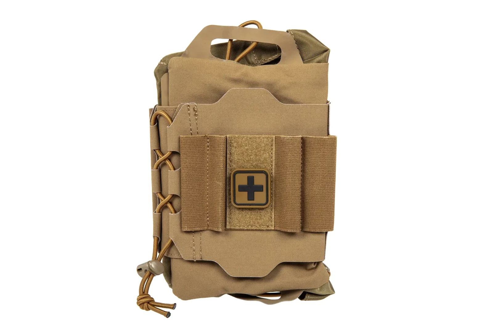 Rękaw transportowy posiada dwa rzepy - przedni z naszywką Medyk, tylni rzep służy do przymocowania całości do kamizelki. Rękaw posiada dodatkowy panel Molle, co pozwala przymocować kolejne elementy wyposażenia np. ładownicę na staze taktyczną.