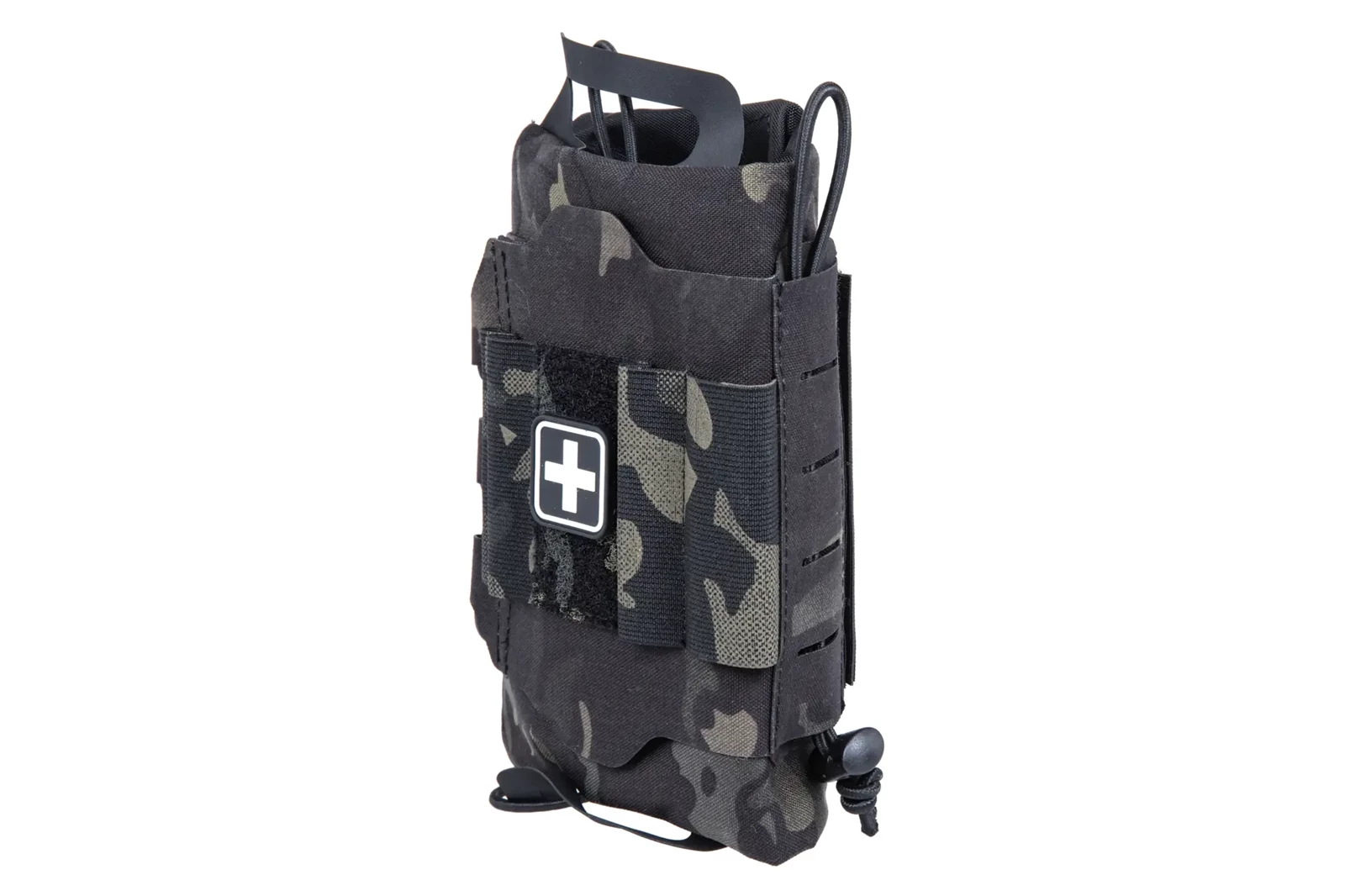 Rękaw transportowy posiada dwa rzepy - przedni z naszywką Medyk, tylni rzep służy do przymocowania całości do kamizelki. Rękaw posiada dodatkowy panel Molle, co pozwala przymocować kolejne elementy wyposażenia np. ładownicę na staze taktyczną.