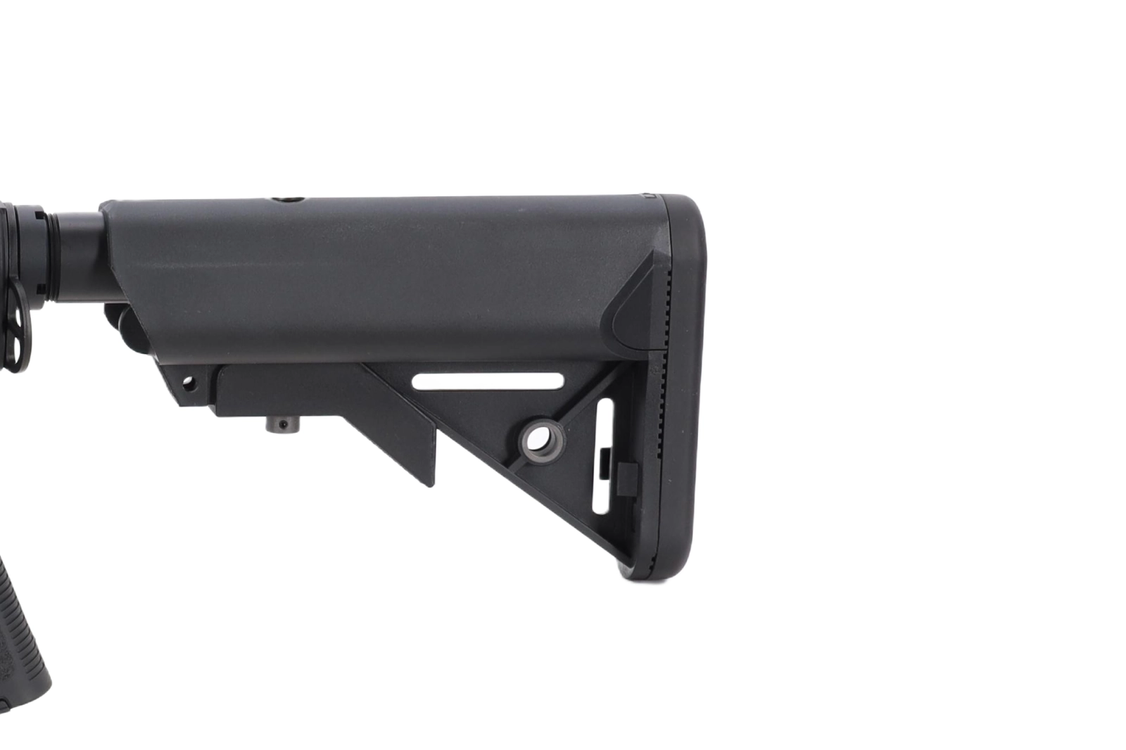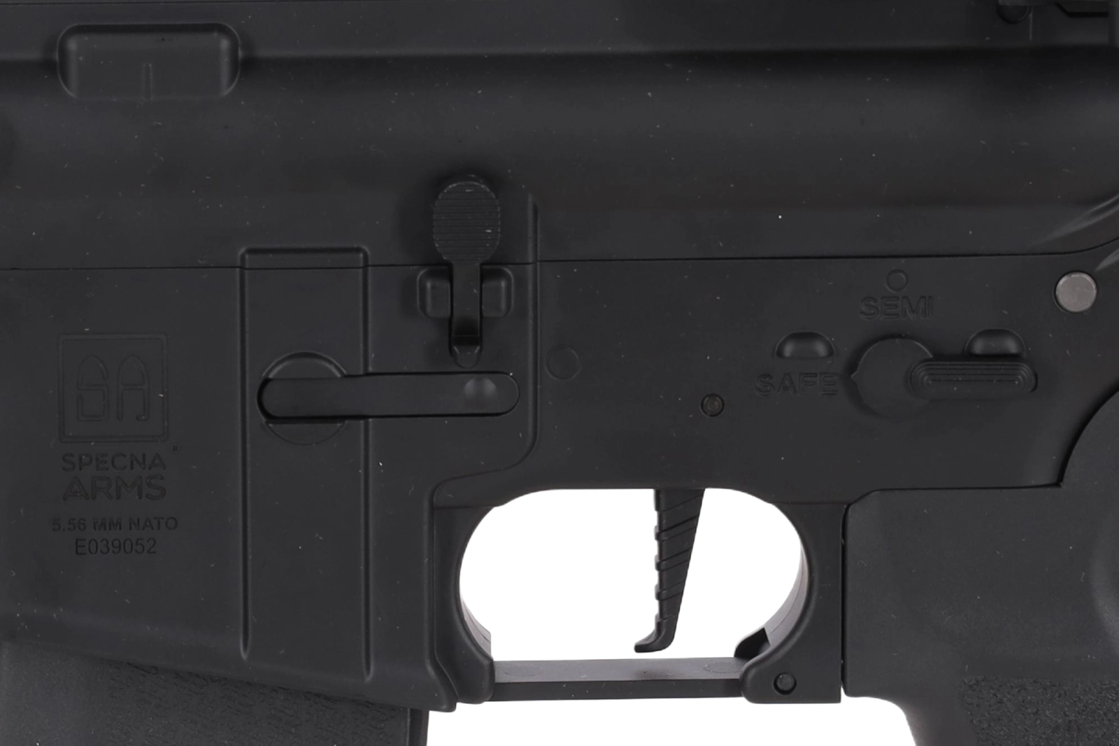 Na korpusie umieszczono oznaczenia Specna Arms oraz indywidualny numer seryjny. Warte uwagi detale to chwyt pistoletowy QD, zapewniający łatwy i szybki dostęp do silnika bez konieczności użycia narzędzi oraz obustronne ucho do montażu zawieszenia taktycznego.