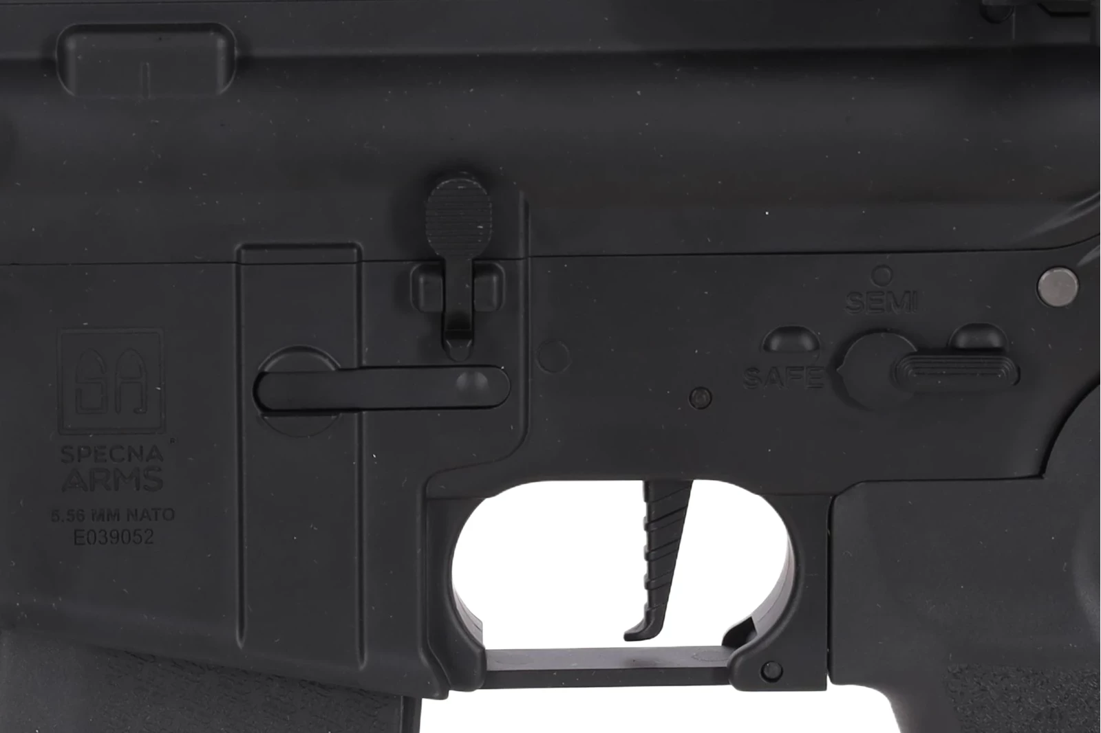 Na korpusie umieszczono oznaczenia Specna Arms oraz indywidualny numer seryjny. Warte uwagi detale to chwyt pistoletowy QD, zapewniający łatwy i szybki dostęp do silnika bez konieczności użycia narzędzi oraz obustronne ucho do montażu zawieszenia taktycznego.