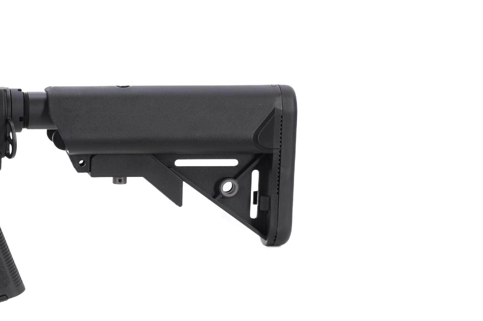 Na korpusie umieszczono oznaczenia Specna Arms oraz indywidualny numer seryjny. Warte uwagi detale to chwyt pistoletowy QD, zapewniający łatwy i szybki dostęp do silnika bez konieczności użycia narzędzi oraz obustronne ucho do montażu zawieszenia taktycznego.