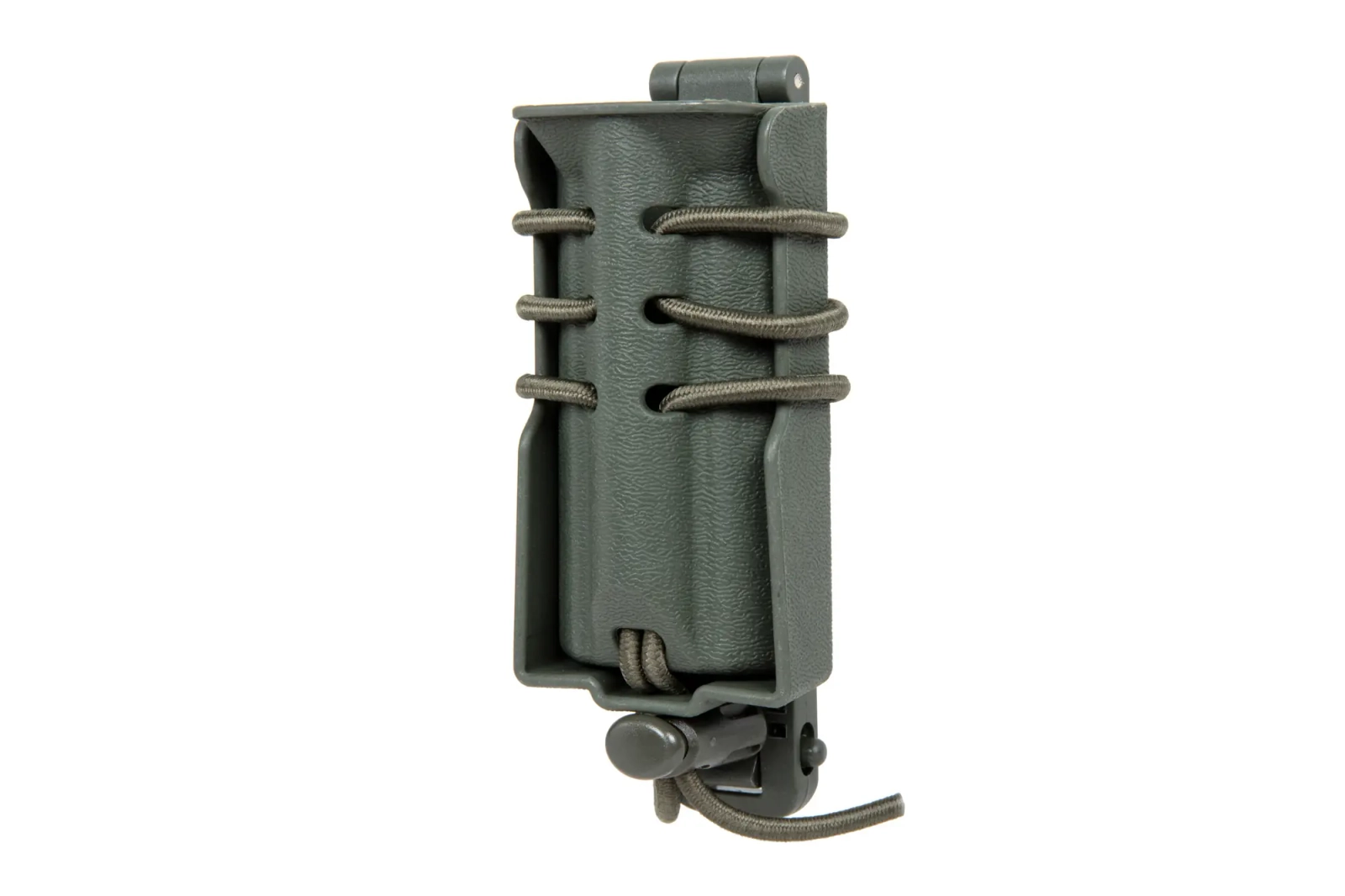 Wykonana z wytrzymałego tworzywa sztucznego ładownica typu fast mieszcząca jeden magazynek 9mm. Ładownica wyposażona jest w specjalną elastyczną linkę do regulacji "rozwarcia" ładownicy która lepiej dopasowuje się do zawartości i nie pozwala magazynkom wypaść. Ładownicę zamontować można na pasie o maksymalnej szerokości 45mm a także na oporządzeniu zgodnym z systemem MOLLE.