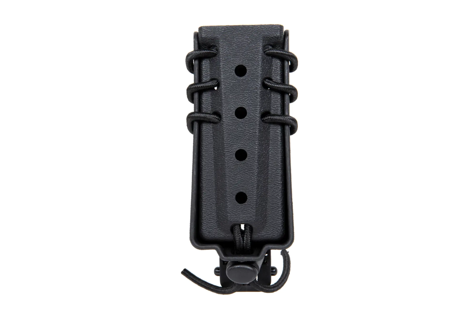 Wykonana z wytrzymałego tworzywa sztucznego ładownica typu fast mieszcząca jeden magazynek 9mm. Ładownica wyposażona jest w specjalną elastyczną linkę do regulacji "rozwarcia" ładownicy która lepiej dopasowuje się do zawartości i nie pozwala magazynkom wypaść. Ładownicę zamontować można na pasie o maksymalnej szerokości 45mm a także na oporządzeniu zgodnym z systemem MOLLE.