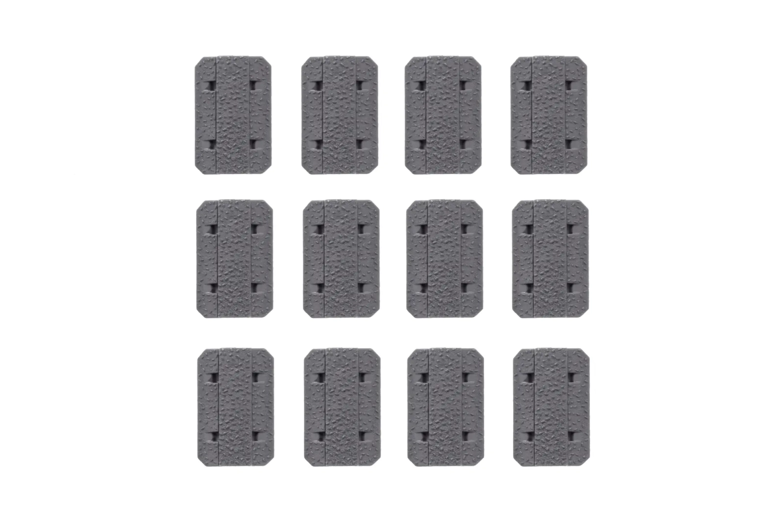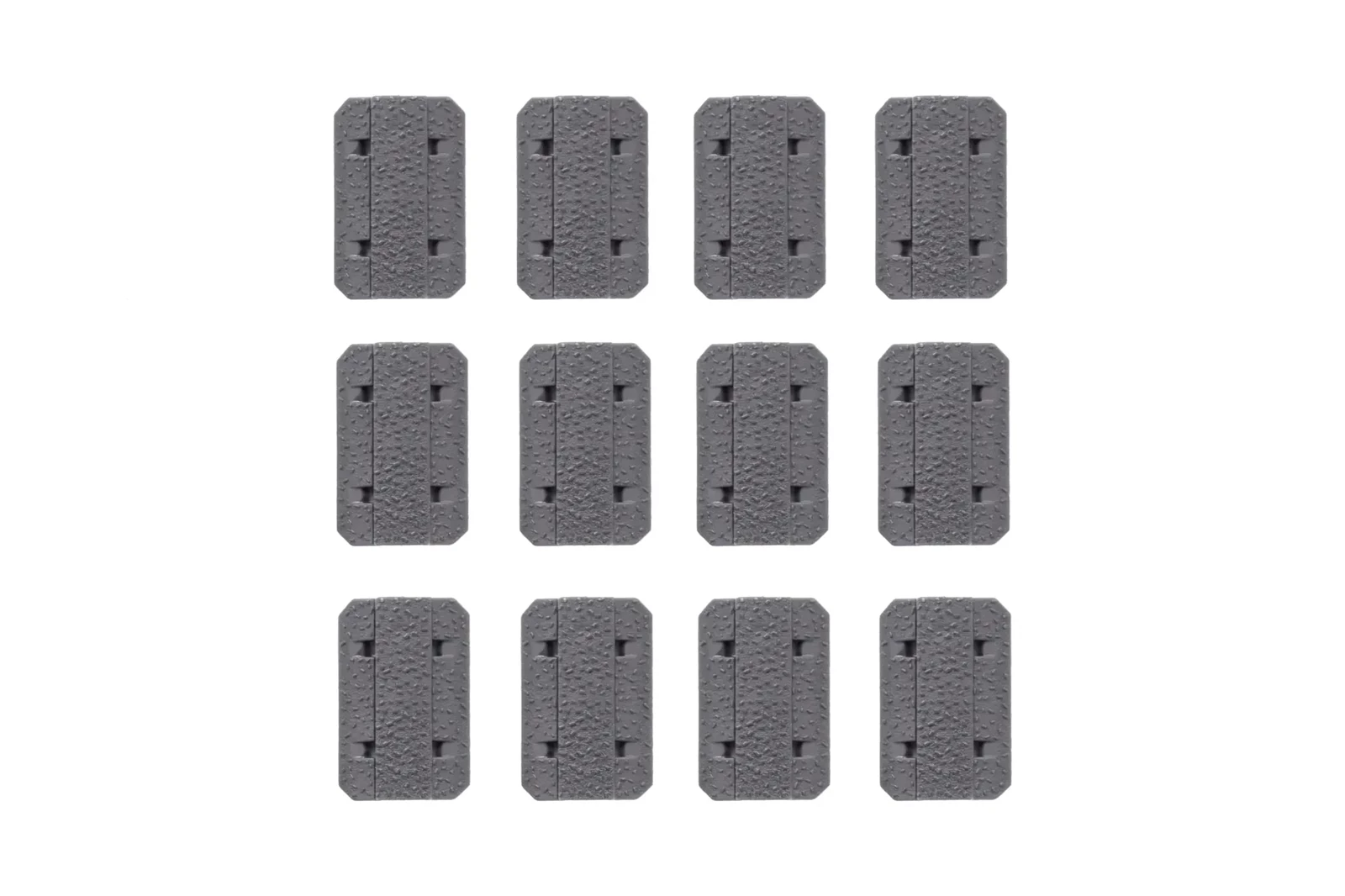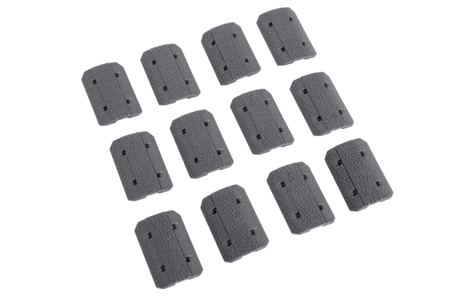 Zestaw 12 osłon wykonanych z polimerowego tworzywa sztucznego, dedykowanych do montażu na szynach M-LOK.
