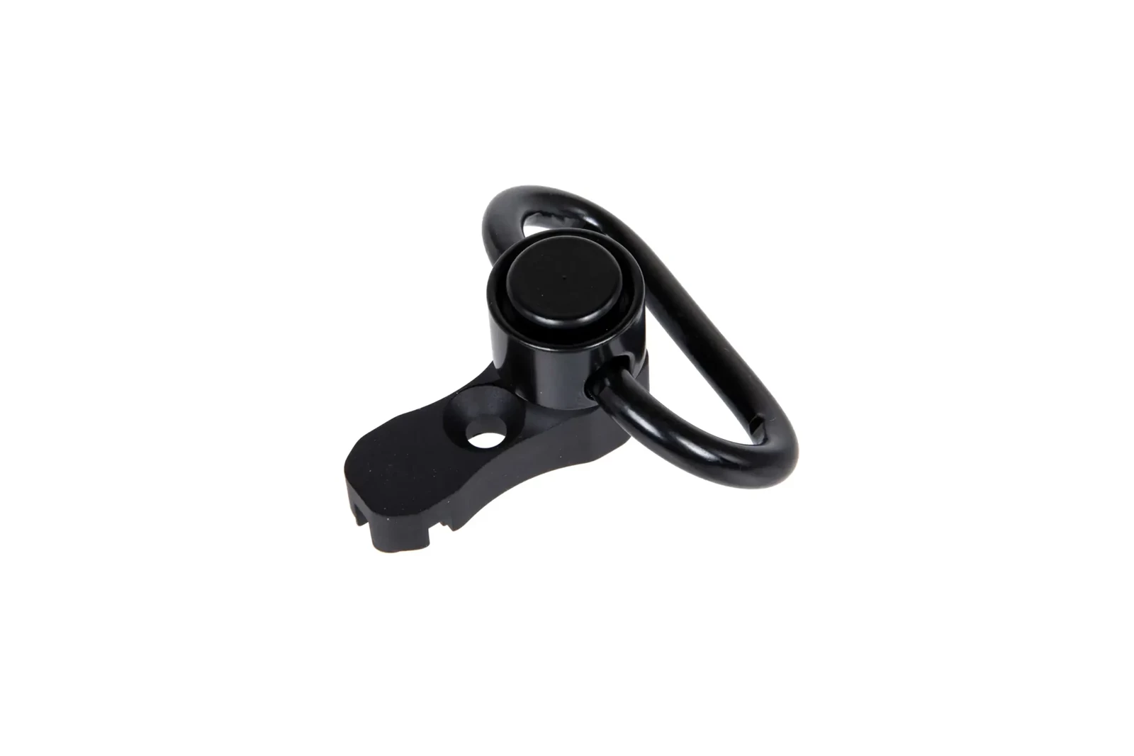 Aluminiowy montaż wraz ze stalowym uchem zawieszenia QD. Przeznaczony do montażu na frontach w systemie KeyMod lub M-LOK. Dodatkowo montaż posiada dodatkowe wcięcie, pozwalające na zarządzanie okablowaniem przycisków żelowych oświetlenia taktycznego lub wskaźników laserowych.