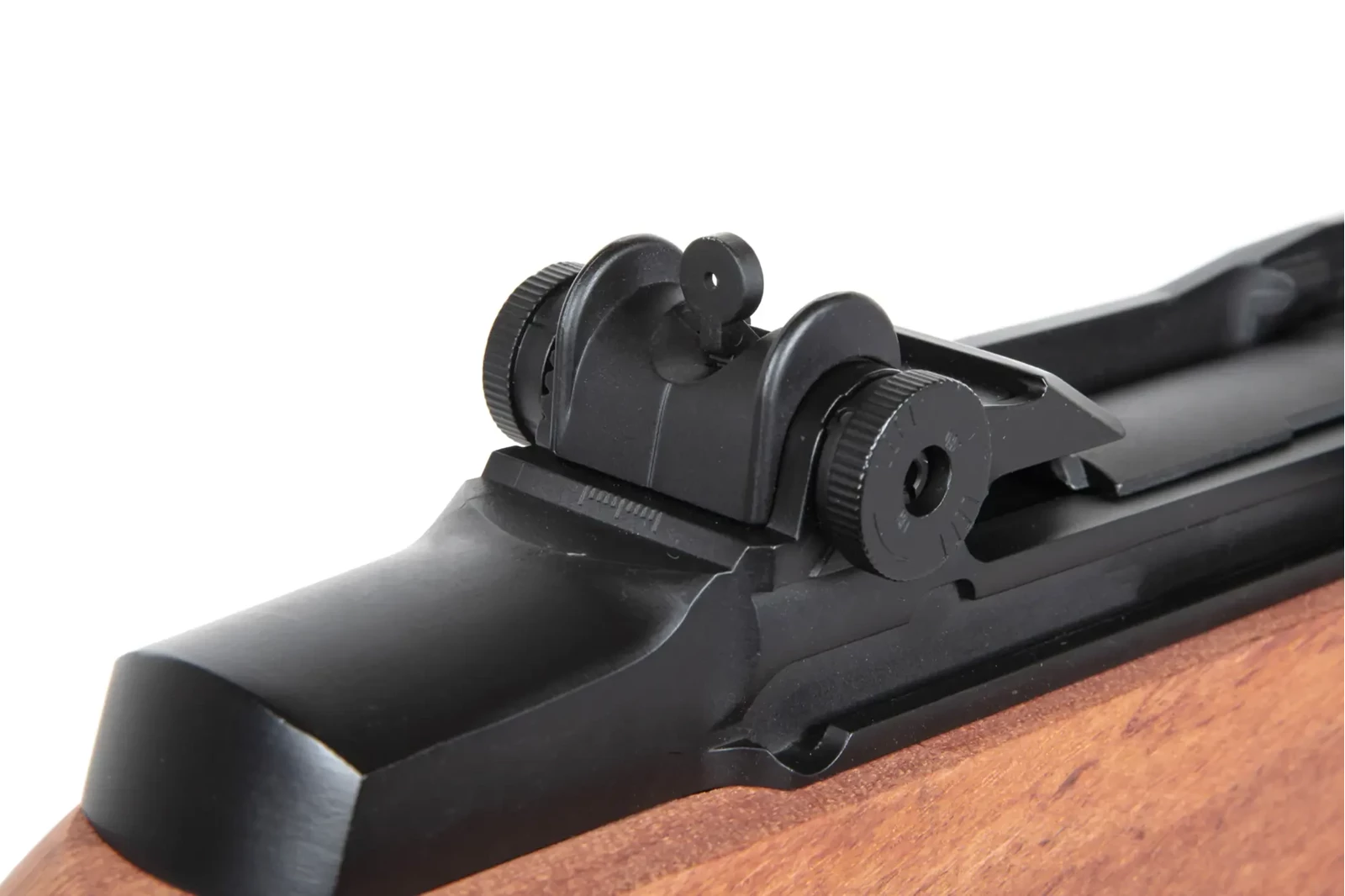 Replika znanej z II Wojny światowej, półautomatycznej, Amerykańskiej konstrukcji - karabinu M1 Garand. Replikę wykonano z wysokiej jakości metalu oraz polimeru. Łoże z kolbą i osłony lufy zostały wykonane z tworzywa sztucznego przypominającego drewno, zarówno kolorem jak i fakturą materiału.