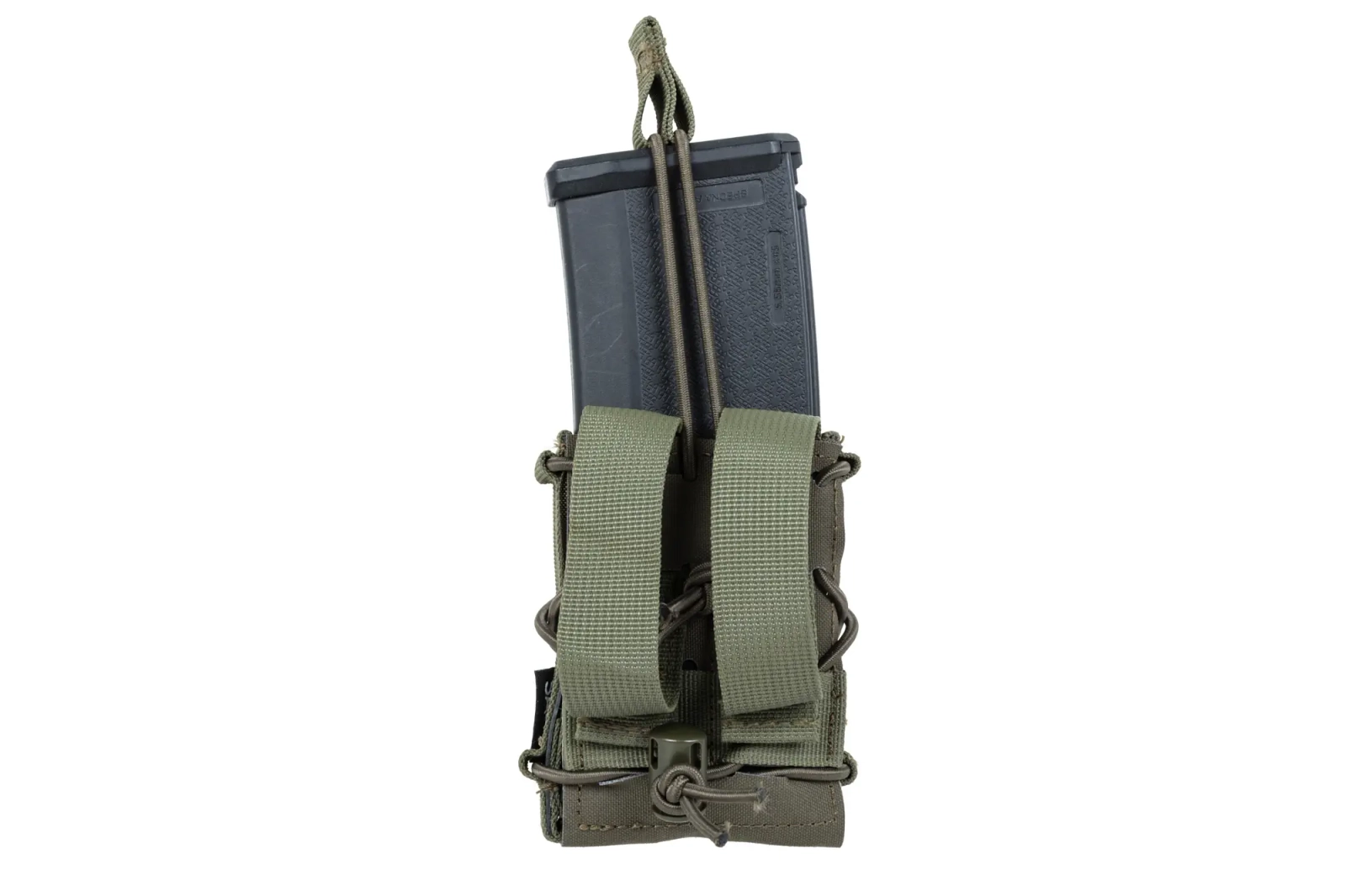 Ładownica typu Open na pojedynczy magazynek typu AR/AK została wykonana przy wykorzystaniu materiałów najwyższej jakości. Zastosowanie dobrych materiałów oraz wytrzymałe szwy dodatkowo zwiększają odporność i trwałość. Każdy magazynek jest od góry zabezpieczony przed wypadnięciem elastyczną linką typu shock-cord i uchwytem. Front ładownicy posiada mocowania Molle Laser-Cut. Ładownice można zamocować na pasie lub na kamizelce, która będzie kompatybilna z systemem MOLLE.