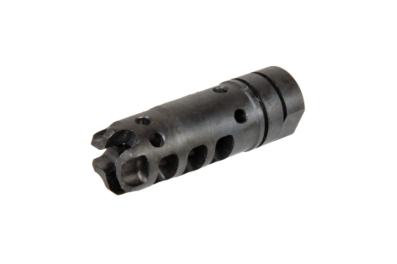 Wysokiej jakości replika urządzenia wylotowego wykonana z oksydowanej stali. W zestawie znajduje się zestaw podkładek/ dystanserów ze stali.