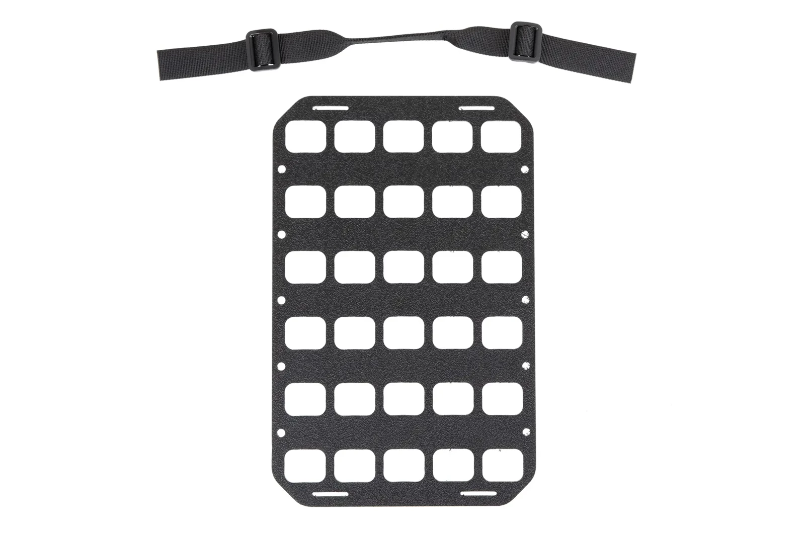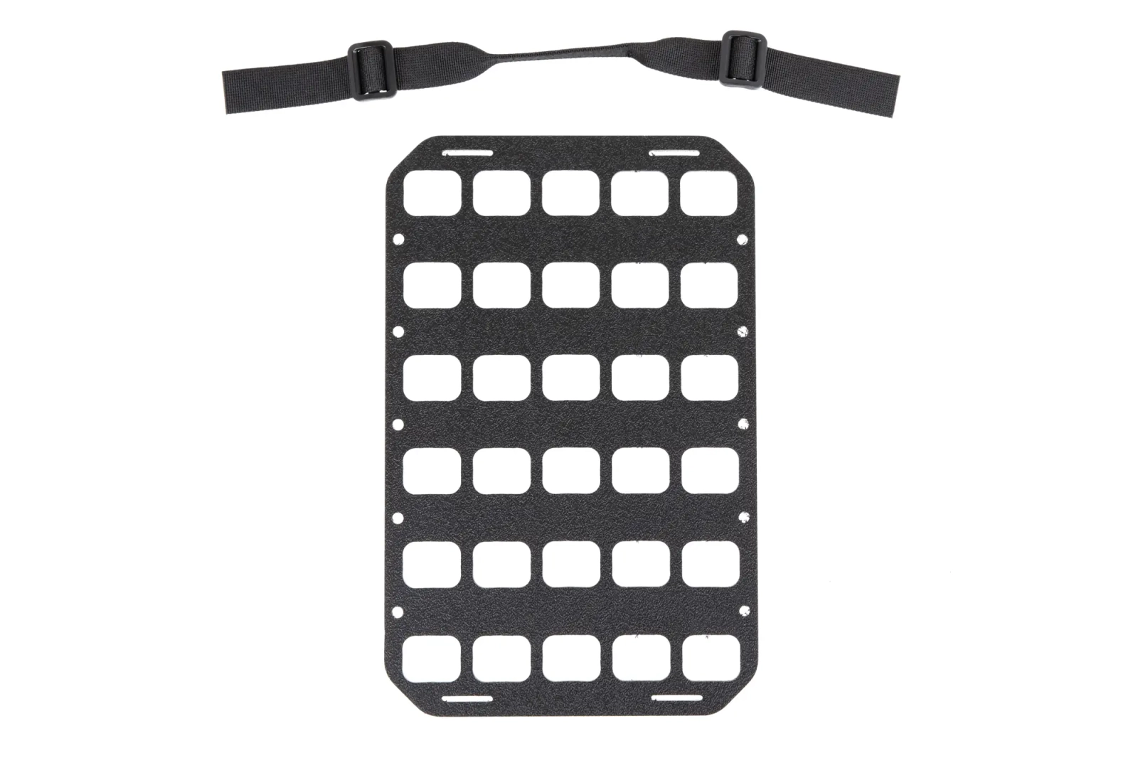 Panel posiada 30 otworów, które pozwolą na montaż akcesoriów (np. kompatybilnych z systemem Molle), 4 otwory na chwyt transportowy oraz 10 okrągłych otworów, które umożliwią montaż na np. ścianie.