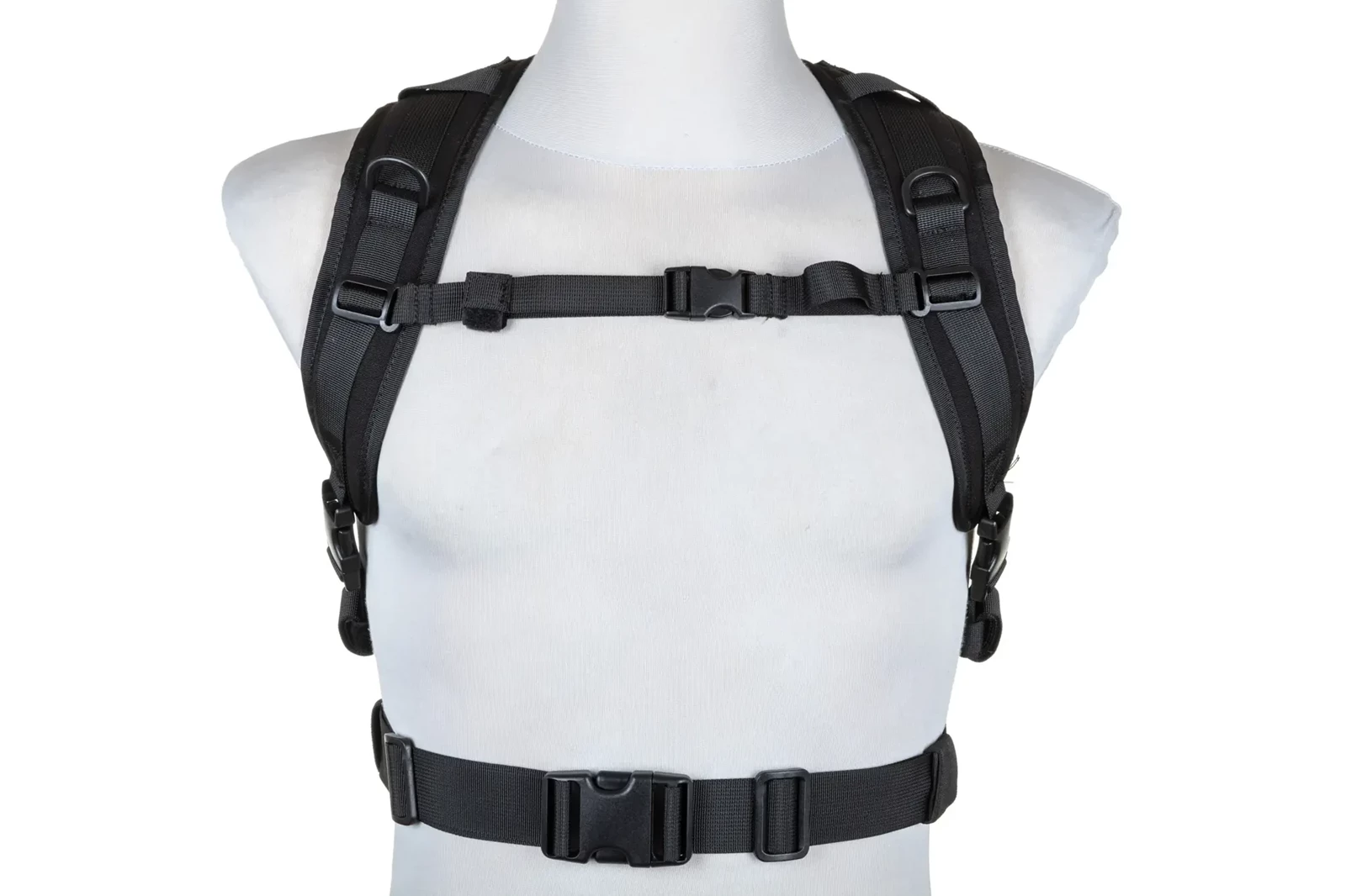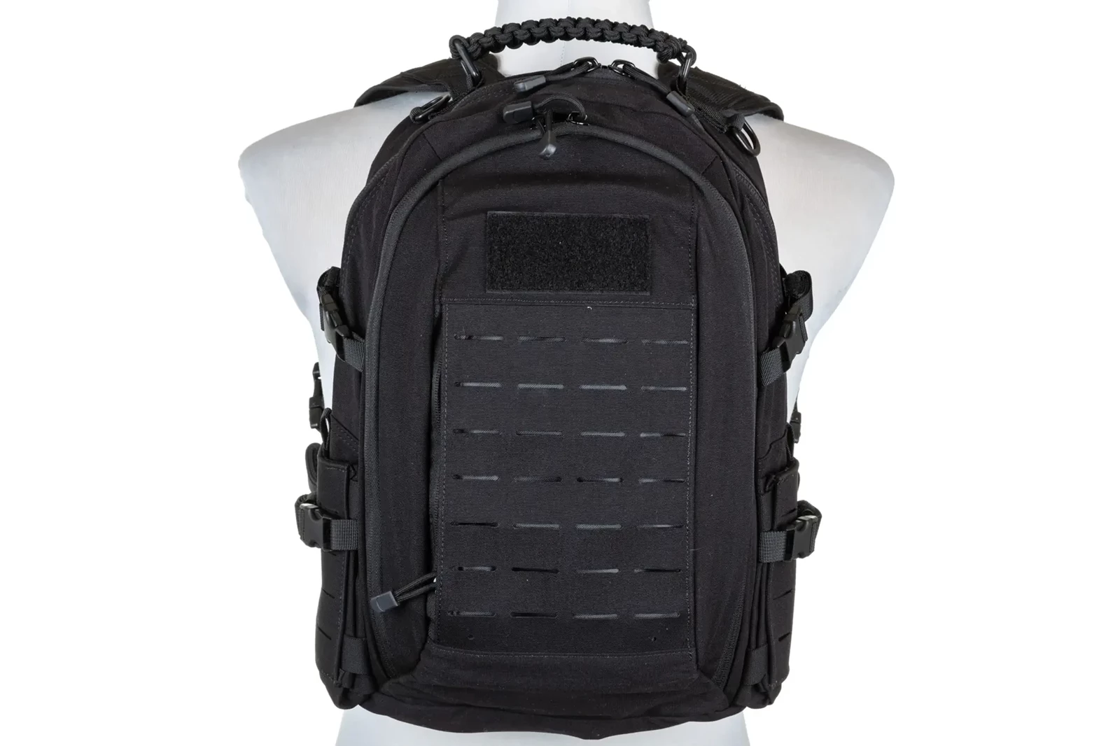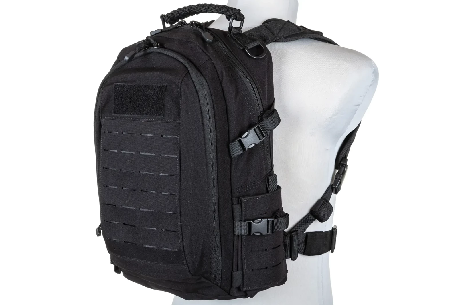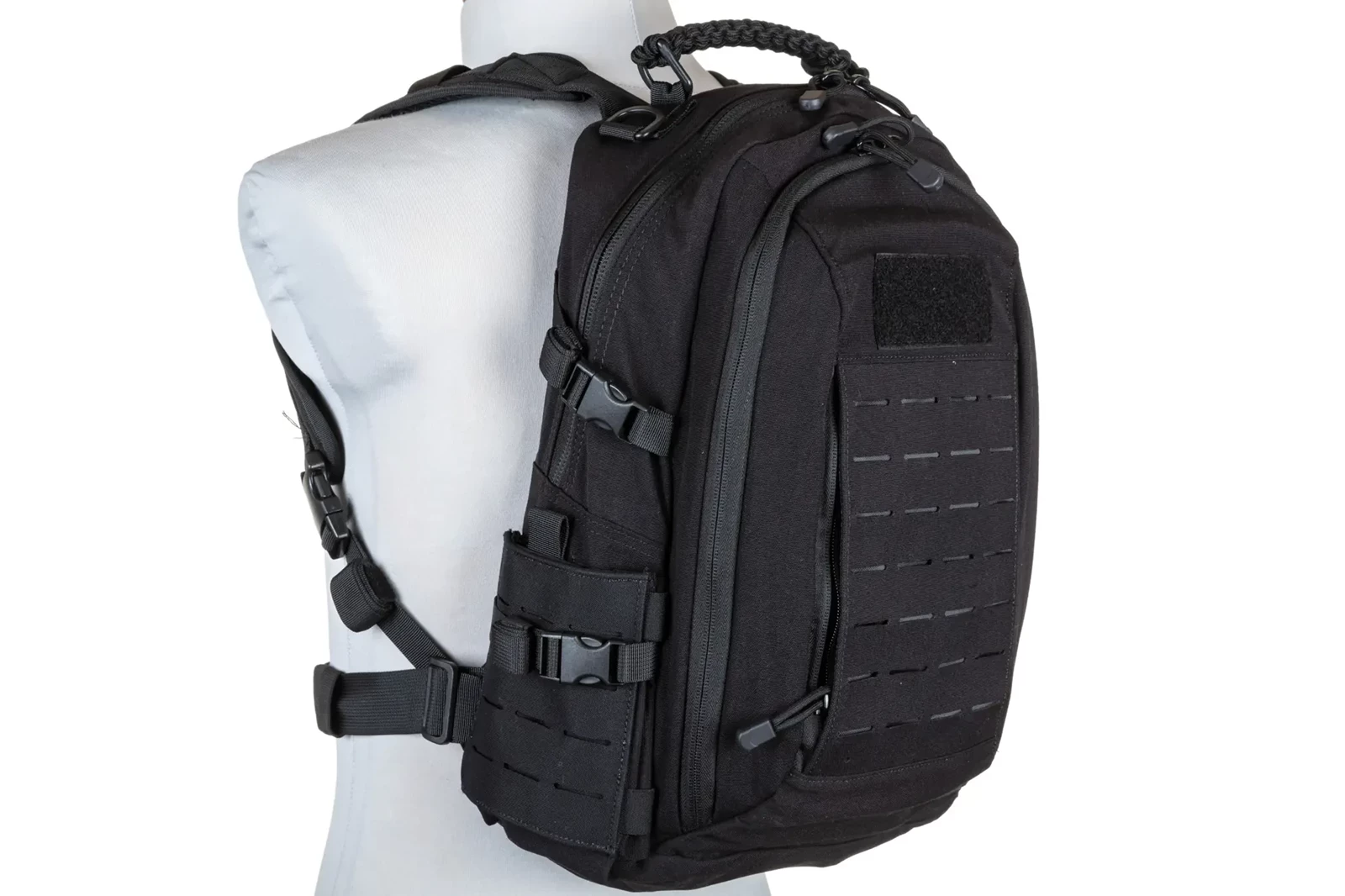 Niezawodnymi zamkami błyskawicznymi, frontowym panelem Molle Laser-Cut, panelem-rzep na naszywki lub identyfikator, bocznymi kieszeniami, które na froncie posiadają panele Molle Laser-Cut, regulowanym pasem biodrowym, regulowaną taśmą piersiową, dodatkową przegrodą "na plecach" na np. wkład hydracyjny, miękkimi comfort-padami dla zwiększenia wygody pleców użytkownika. Wewnętrzna strona plecaka jest częściowo pokryta tkaniną typu Mesh.