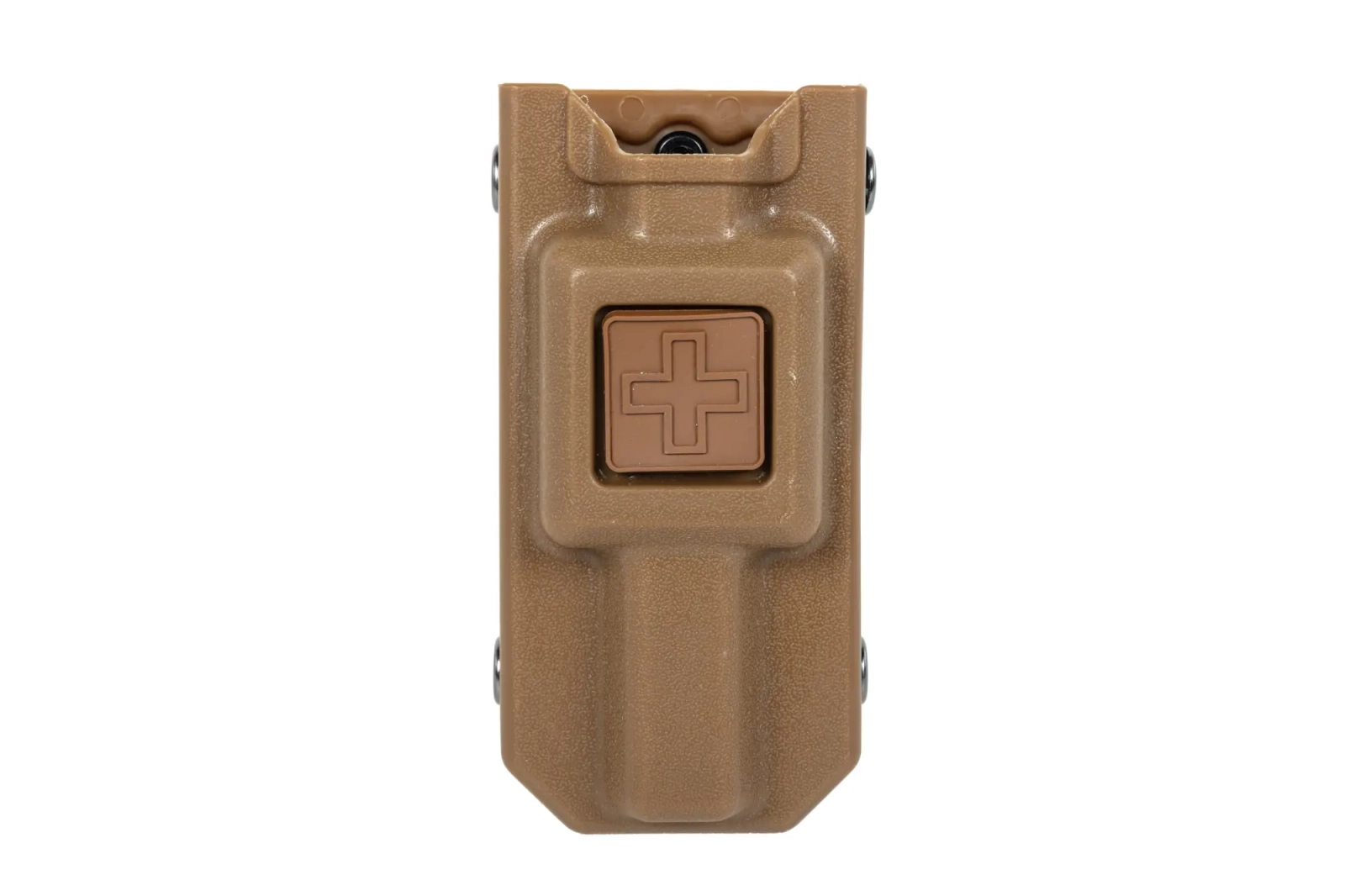 Ładownica na stazę taktyczną typu CAT została wykonana przy wykorzystaniu wytrzymałego tworzywa. Model jest kompatybilny z systemem MOLLE, co umożliwi zamocowanie na pasie, kamizelce czy bezpośrednio na apteczce. Front posiada naklejony symbol medyczny, który pozwoli na szybką identyfikację ładownicy