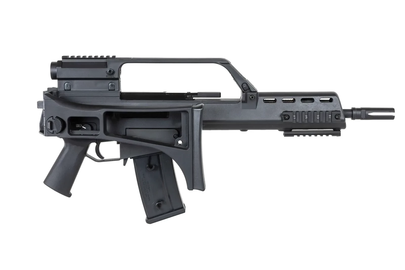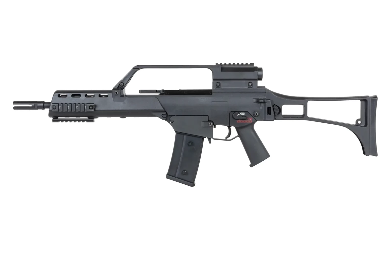 Karabinek ASG od firmy SRC Dual Power SR36K GB-304 został wyposażony w lunetę zintegrowaną z chwytem transportowym.