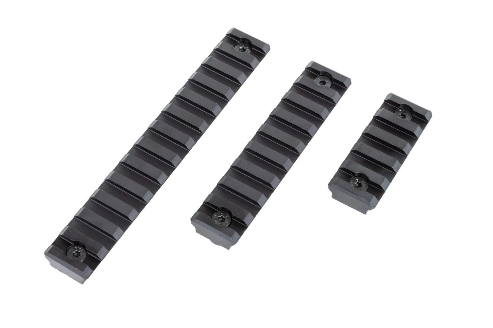 Zestaw 3 szyn kompatybilnych z szynami M-LOK, zostały wykonane z wytrzymałego aluminium. Szyny posiadają długość: