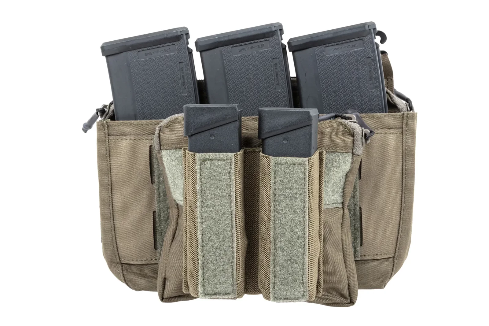 W zestawie dołączono dodatkowo kieszonkę zamykaną na zamek błyskawiczny wraz z ładownicą na dwa magazynki pistoletowe. Użytkownik może bez problemu przypiąć kieszonkę do rzepa na przodzie panelu lub wykorzystać wspomnianą już przegrodę. Tył produktu posiada obszerny rzep, który umożliwi montaż na np. Plate Carrierze.